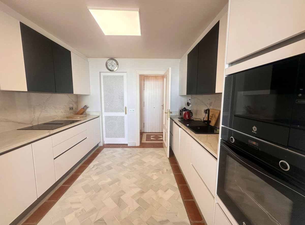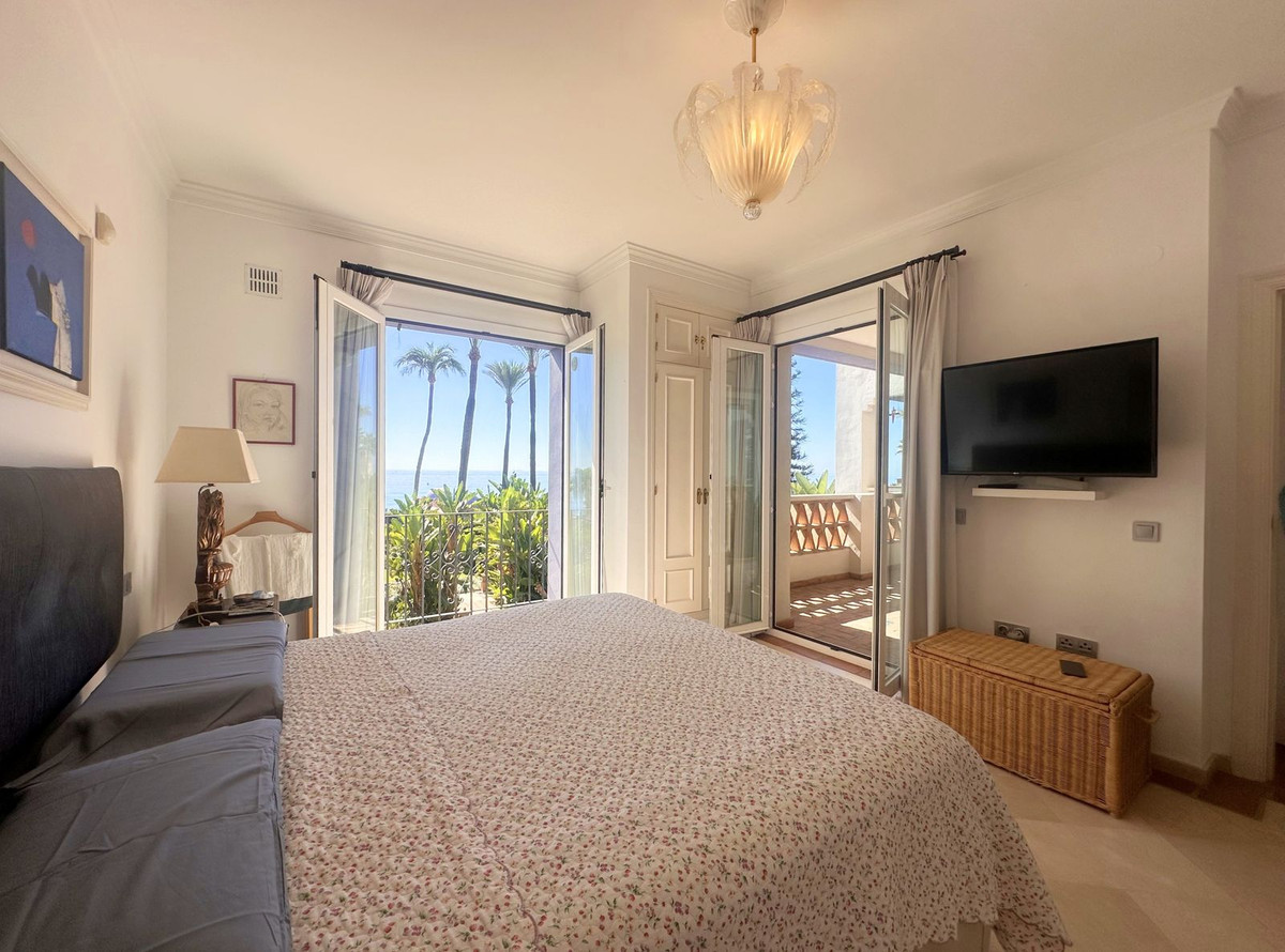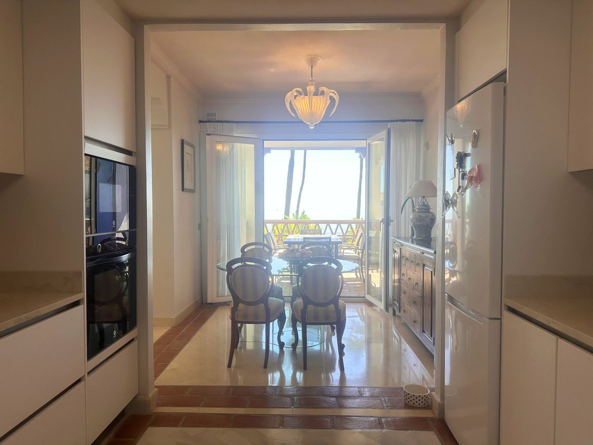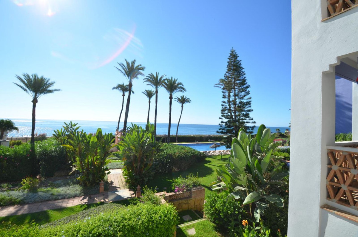 Luxury front line beach middle floor apartment. Located mid way between Estepona and the La Duquesa Marina, 5 minutes drive to all amenities and leisure areas, including excellent golf courses, one of them Finca Cortesín, home of the Volvo Masters.Only a few steps from magnificent beaches, restaurants and to a new beach club. 15 minutes walk through the prominade to the fishing village of Sabinillas. This property has just been recently reformed to a very high quality, magnificent kitchen with even coffee machine and wine cellar integrated, beautifull design living room, new a/c, etc. The property is south facing and enjoy stunning views to the Mediterranean Sea, Gibraltar and coast of Africa. Immaculate and quiet gated development with 24 hours security, with large gardens of beautiful features and fountains, 4 swiming pools, 2 of them heated. Great rental potential! Parking and storage room with an easy access with lift. Viewing is highly recommended!! JUST IN THE MARKET.