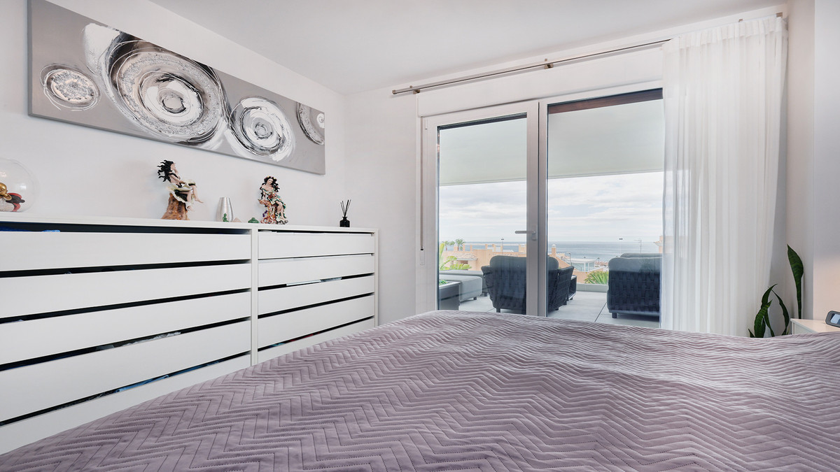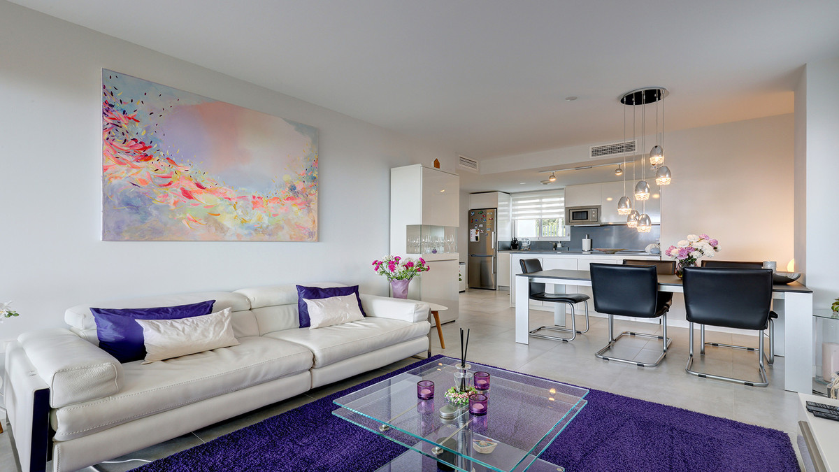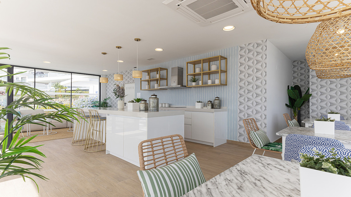 Tout droit, la cuisine ouverte, la salle à manger et le salon sont lumineux et modernes, donnant directement sur la grande terrasse, idéale pour dîner en plein air ou profiter des longs après-midi ensoleillés espagnols tout en profitant de la vue imprenable sur la mer.