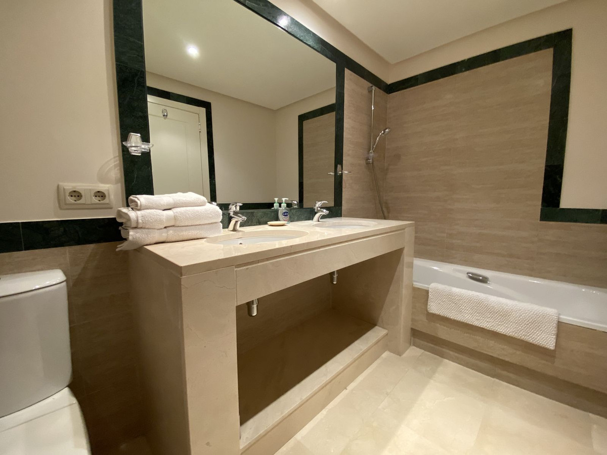 La chambre principale est extrêmement spacieuse et dispose de placards intégrés et de nombreux rangements. Elle dispose également d'une grande salle de bains attenante avec des finitions en marbre et granit, une double vasque, un bidet et une baignoire avec douche.