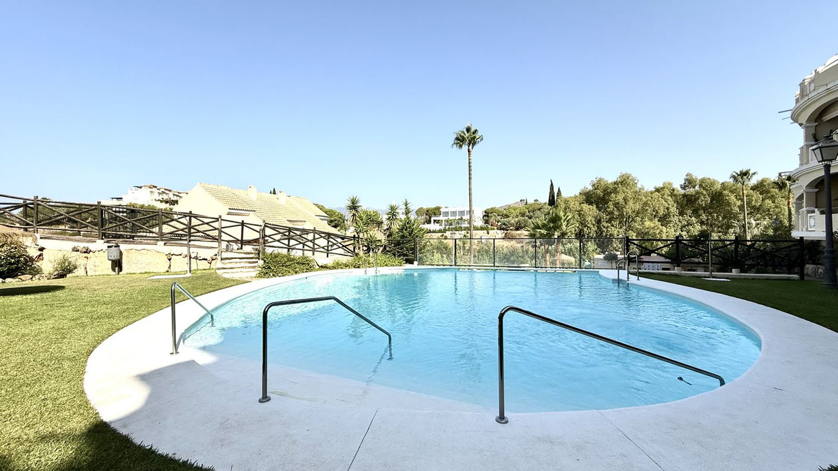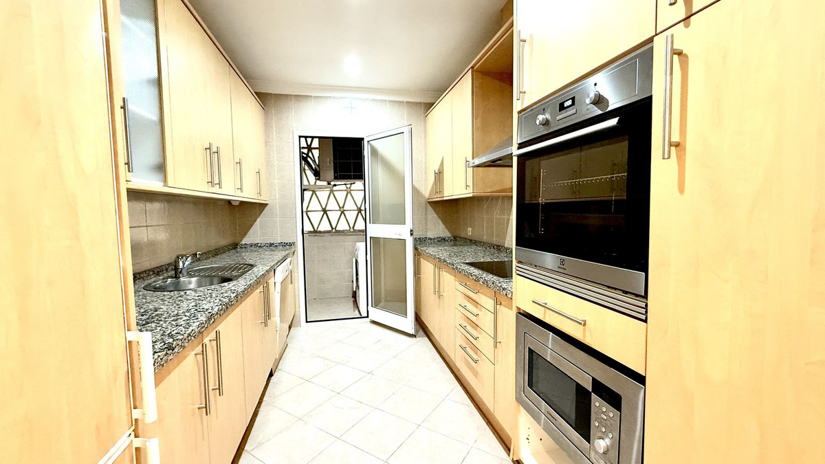 La cuisine entièrement équipée est séparée et comprend un espace buanderie. Grâce à sa position surélevée, l'appartement bénéficie d'intimité et de vues dégagées, tout en bénéficiant d'un accès facile aux jardins et à la piscine communs.