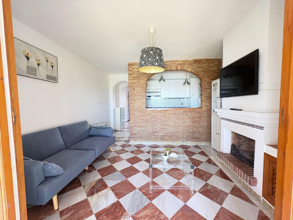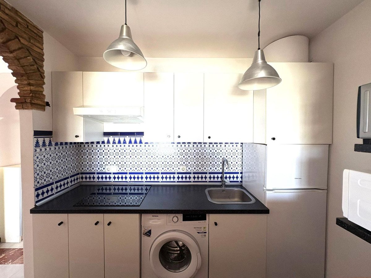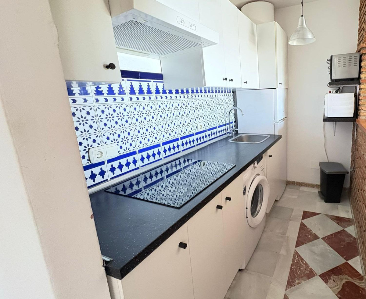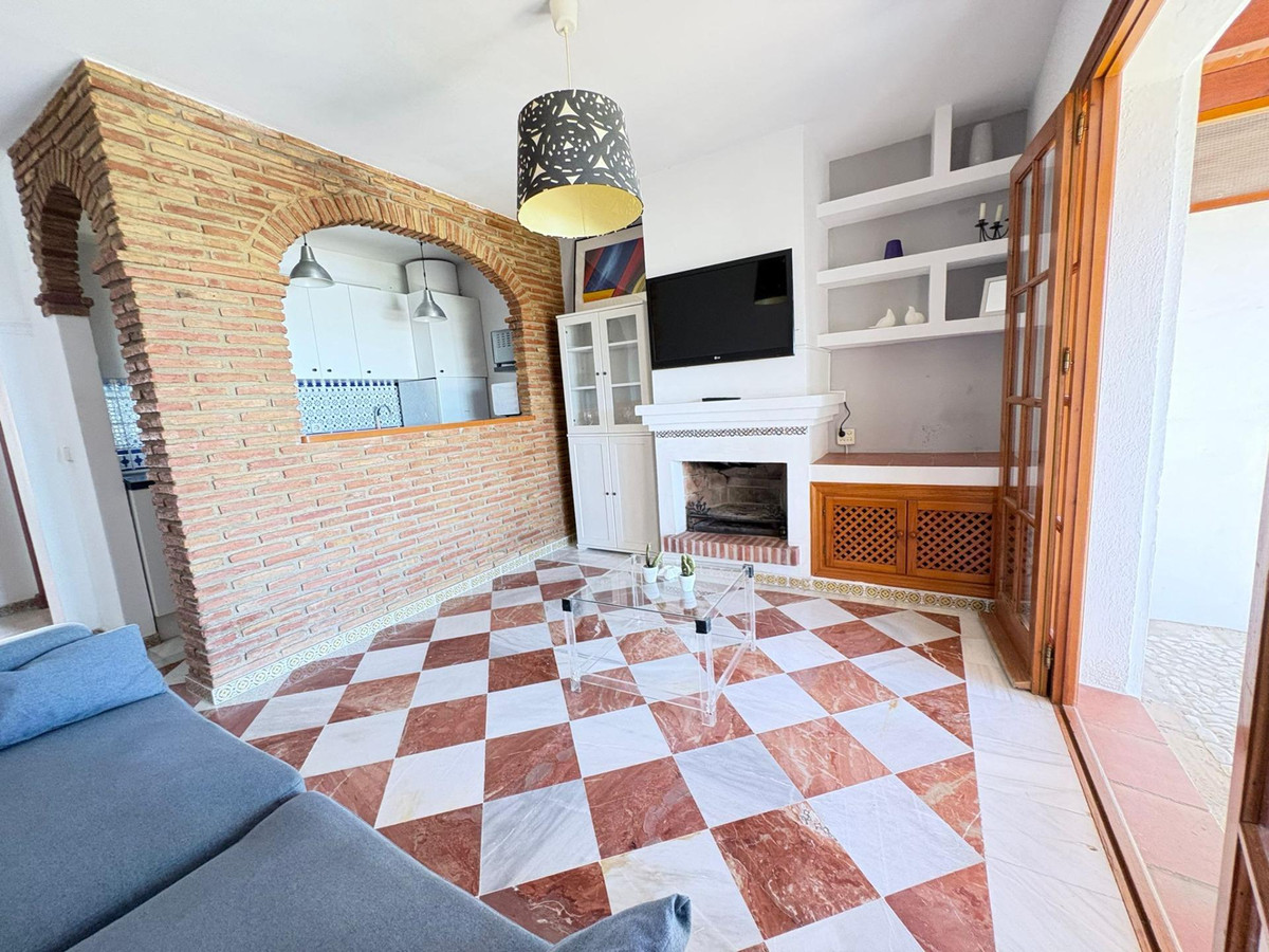 La propriété comprend une chambre spacieuse avec placards intégrés, une salle de bain complète ornée de carrelage andalou traditionnel et un agencement pensé pour optimiser chaque mètre carré. Le salon lumineux et accueillant, doté d'une cheminée, apporte chaleur et caractère, idéal pour des soirées conviviales. La cuisine ouverte, entièrement équipée, s'intègre harmonieusement à l'espace de vie, créant une atmosphère fonctionnelle et moderne tout en conservant une touche classique.