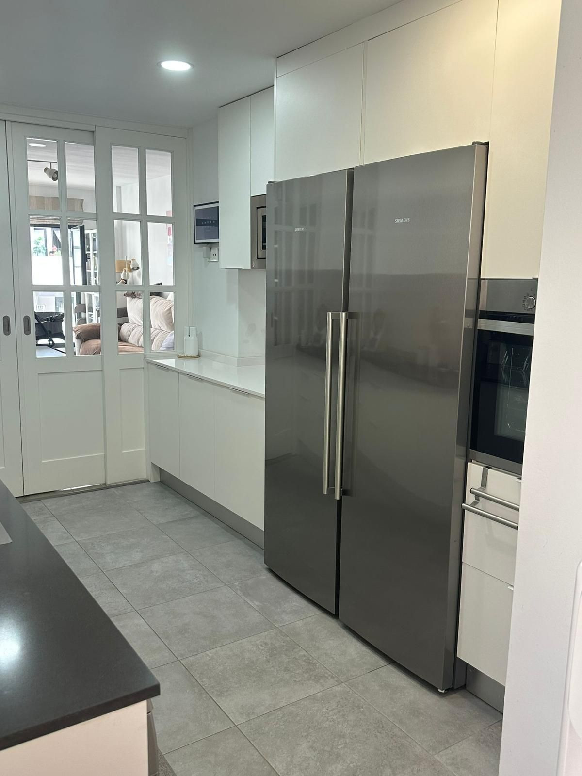 La cuisine est indépendante, mais dotée de portes coulissantes sur mesure s'ouvrant vers l'extérieur, permettant de la connecter au salon-salle à manger selon les besoins, sans occuper d'espace et créant une impression d'ouverture et de fluidité. L'appartement comprend trois chambres avec placards intégrés, dont la principale avec salle de bains attenante, ainsi qu'une seconde salle de bains complète.