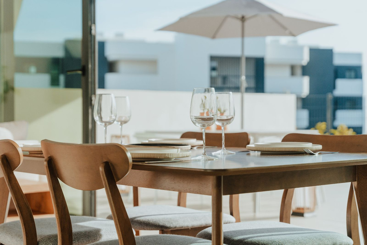 L'espace de vie ouvert communique harmonieusement avec la spacieuse terrasse exposée ouest et le jardin privé, d'une superficie totale de près de 50 m². Ce lieu offre un cadre idéal pour un repas en plein air, un café matinal ou une détente au soleil face à la piscine et aux jardins paysagers. Son orientation assure une lumière naturelle chaleureuse tout au long de la journée et de magnifiques couchers de soleil le soir.