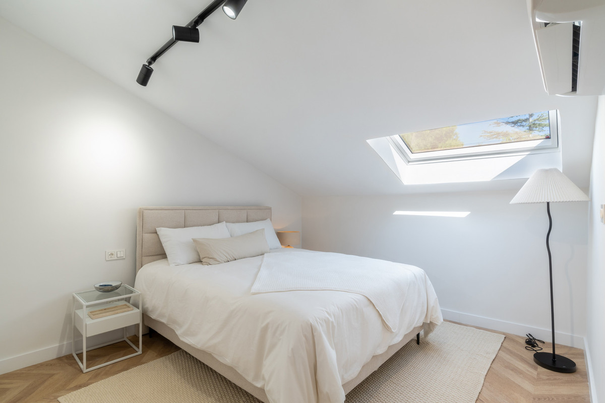 À l'intérieur, le rez-de-chaussée s'étend sur près de 80 m² et comprend une élégante cuisine ouverte, un spacieux séjour, un hall d'entrée et des toilettes invités. L'espace est imprégné des principes de design scandinave, avec des matériaux modernes de haute qualité soigneusement sélectionnés. Sous l'escalier se trouve un cellier sur mesure. Toutes les pièces sont équipées de systèmes Airzone à réglage individuel pour le chauffage et la climatisation, tandis que toutes les salles de bains sont équipées d'un chauffage au sol. Les pièces d'eau sont revêtues d'un carrelage élégant, toute hauteur, dans un ton beige chaleureux.