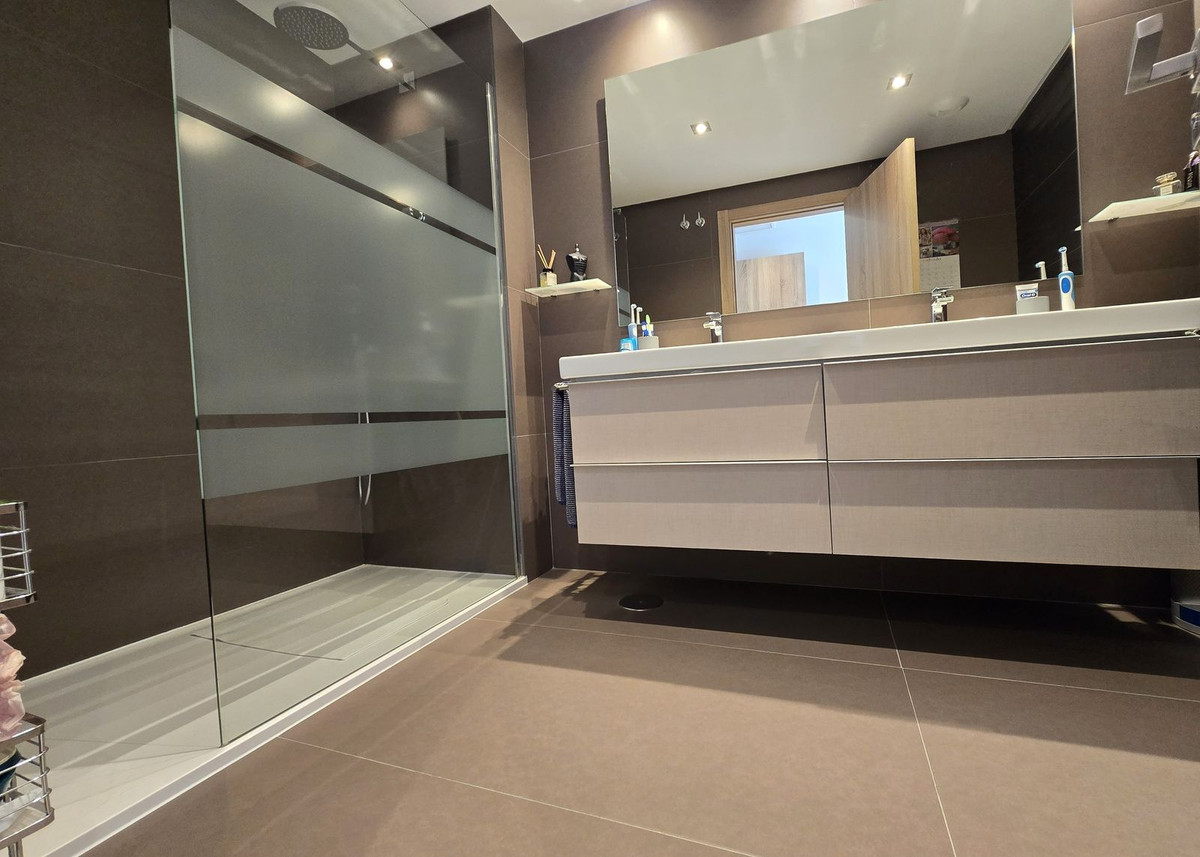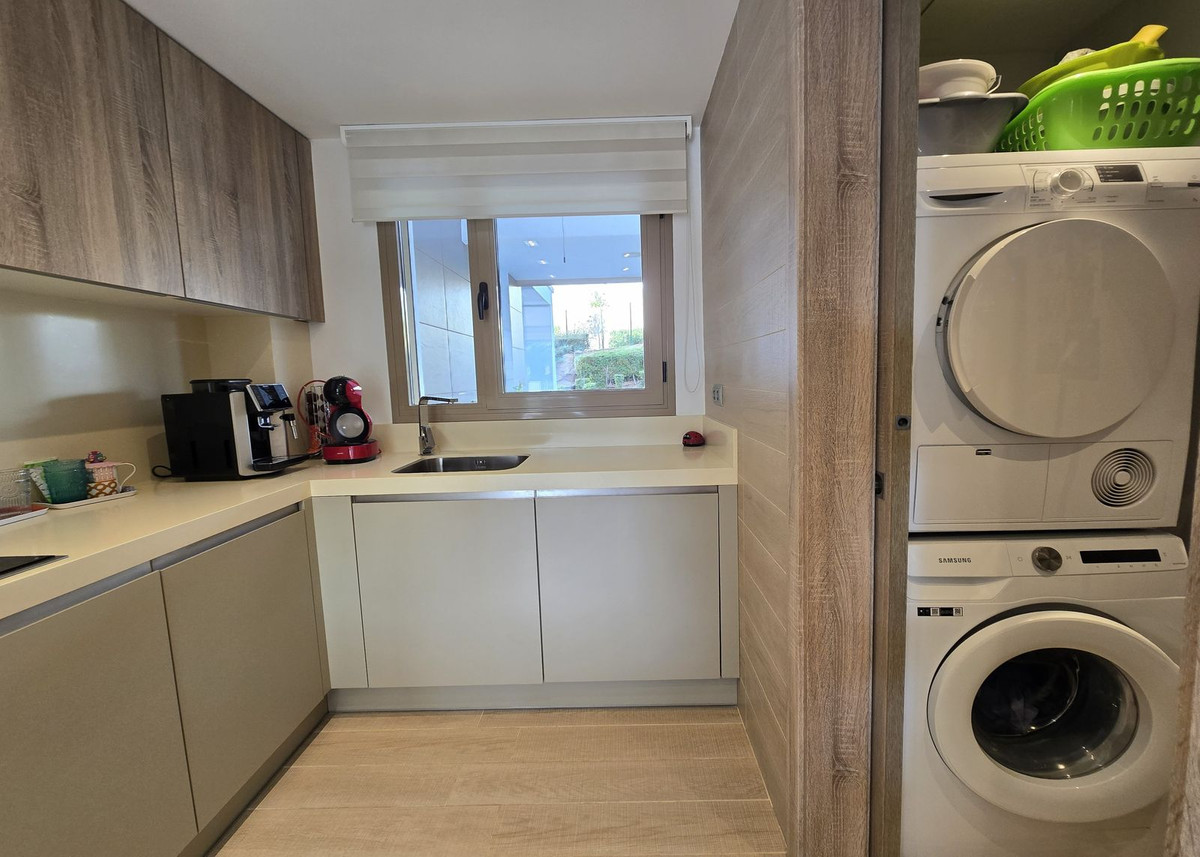 L'appartement dispose d'un spacieux et lumineux séjour-salle à manger ouvrant sur la terrasse, créant une parfaite harmonie entre l'intérieur et l'extérieur pour se détendre et profiter d'une vue imprenable sur le golf. La cuisine entièrement équipée, avec son élégant plan de travail en résine et sa buanderie attenante, allie style et fonctionnalité. Les chambres spacieuses sont dotées de grands placards et de fenêtres oscillo-battantes en aluminium à double vitrage et de volets roulants électriques. La climatisation (chaud et froid) et le chauffe-eau solaire thermique à économie d'énergie assurent un confort moderne.