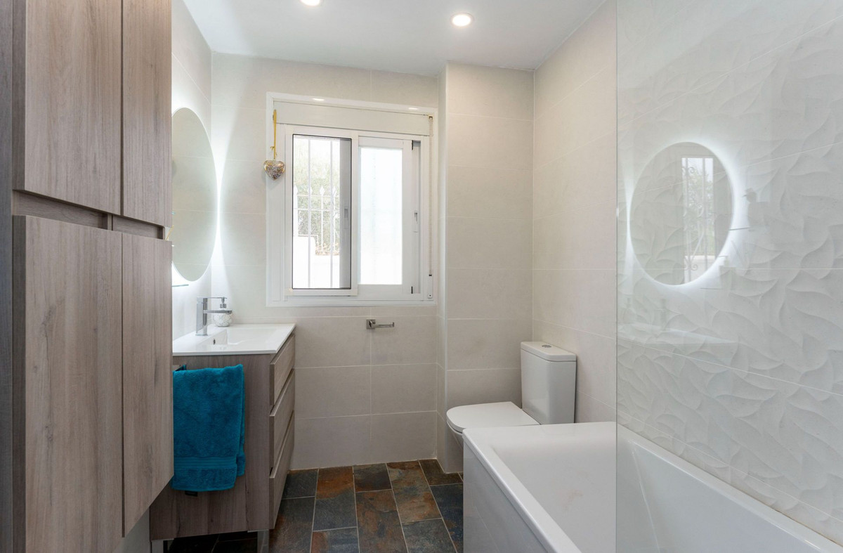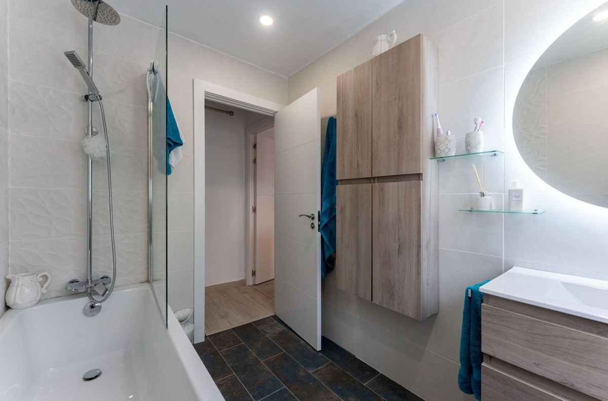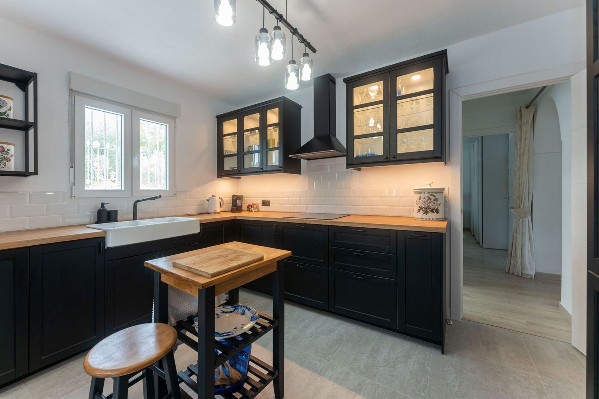 Le rez-de-chaussée dispose d'une spacieuse terrasse couverte, idéale toute l'année, qui mène à un salon-salle à manger lumineux et aéré. De là, une arche mène à une chambre double avec de nombreux placards, une salle de bain entièrement équipée avec baignoire et une cuisine spacieuse avec buanderie séparée. Cette buanderie offre des rangements supplémentaires et un accès direct à la piscine et à la cuisine d'été, créant ainsi une ambiance conviviale pour les réceptions en plein air.