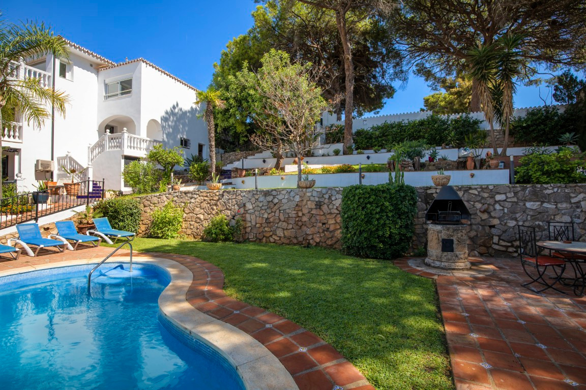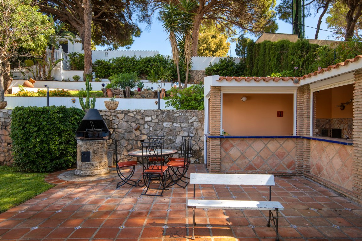 L'extérieur est un véritable havre de paix méditerranéen, avec un jardin luxuriant et arboré, des jeux d'eau autour d'une grande piscine privée, avec douche, salle de bain extérieure et cuisine d'été entièrement équipée avec barbecue, idéale pour recevoir et profiter du climat de la Costa del Sol. La propriété comprend également un garage couvert et un parking supplémentaire sur place.