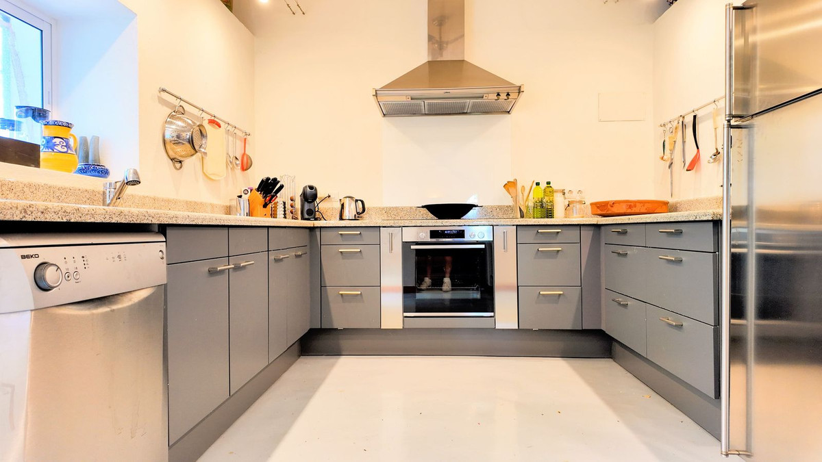 Le spacieux séjour, avec cheminée et grandes fenêtres, offre une luminosité abondante et une atmosphère chaleureuse et accueillante. La grande cuisine en U, entièrement équipée et dotée de hauts plafonds, est reliée à une buanderie pratique avec réfrigérateur, lave-linge et sèche-linge.