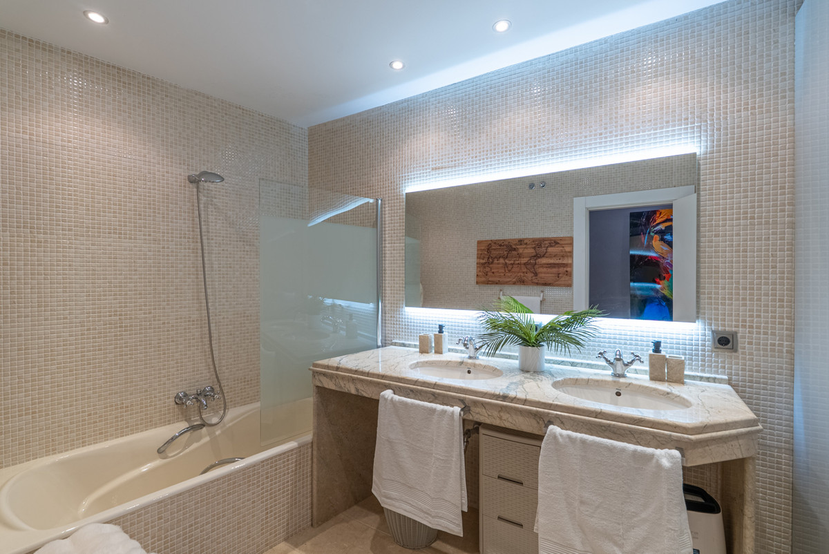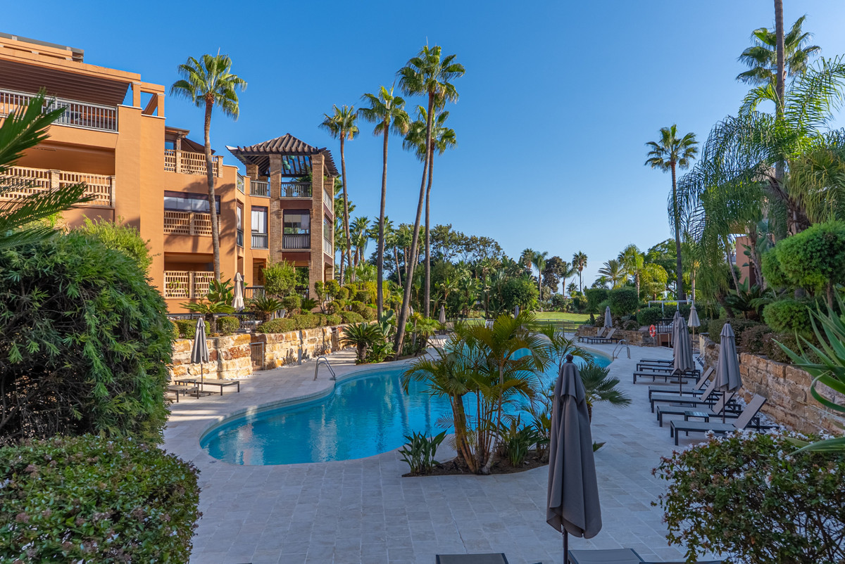 The apartment benefits from large covered and uncovered terraces with views over the gardens and the pool—perfect for relaxing or entertaining outdoors. It comes fully furnished and includes underfloor heating in the bathrooms, air conditioning, and fiber optic internet.