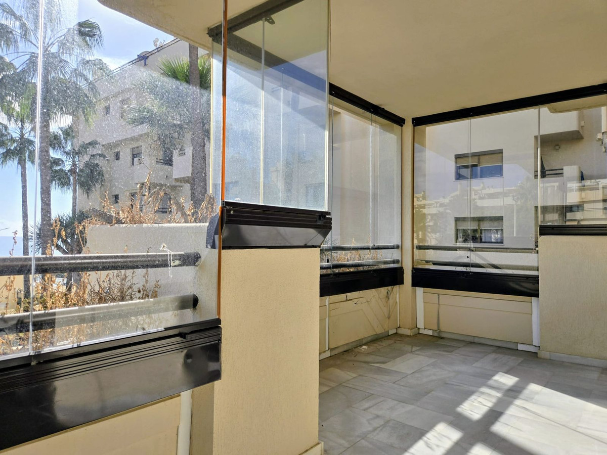 Situé au rez-de-chaussée, l'appartement offre une surface habitable d'environ 60 m², plus une terrasse privée de 10 m², accessible depuis le salon et la chambre. Entièrement clos de rideaux de verre rétractables, cet espace est agréable à vivre toute l'année, que ce soit pour un café matinal avec vue sur la mer ou pour des soirées relaxantes avec vue sur les jardins et la plage. Il comprend une chambre double avec placards intégrés, une salle de bain complète, une cuisine entièrement équipée et un confortable séjour ouvrant sur la terrasse, idéal pour se détendre ou dîner en plein air.