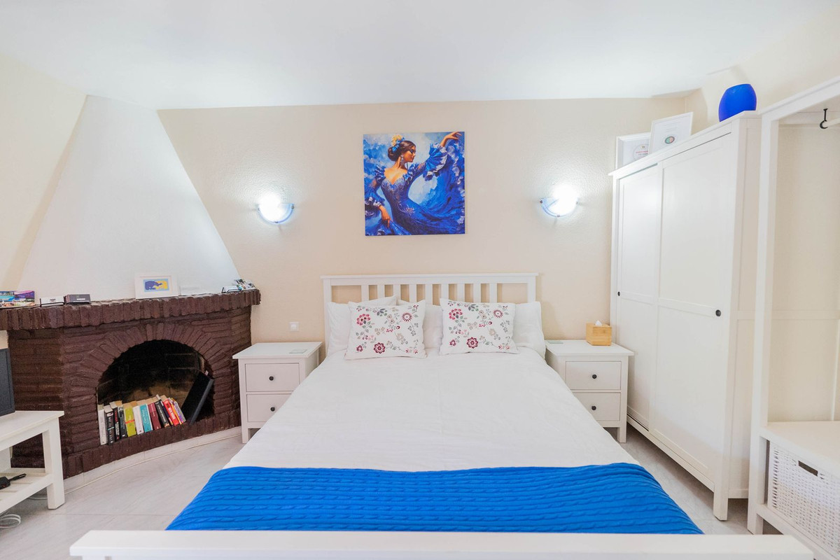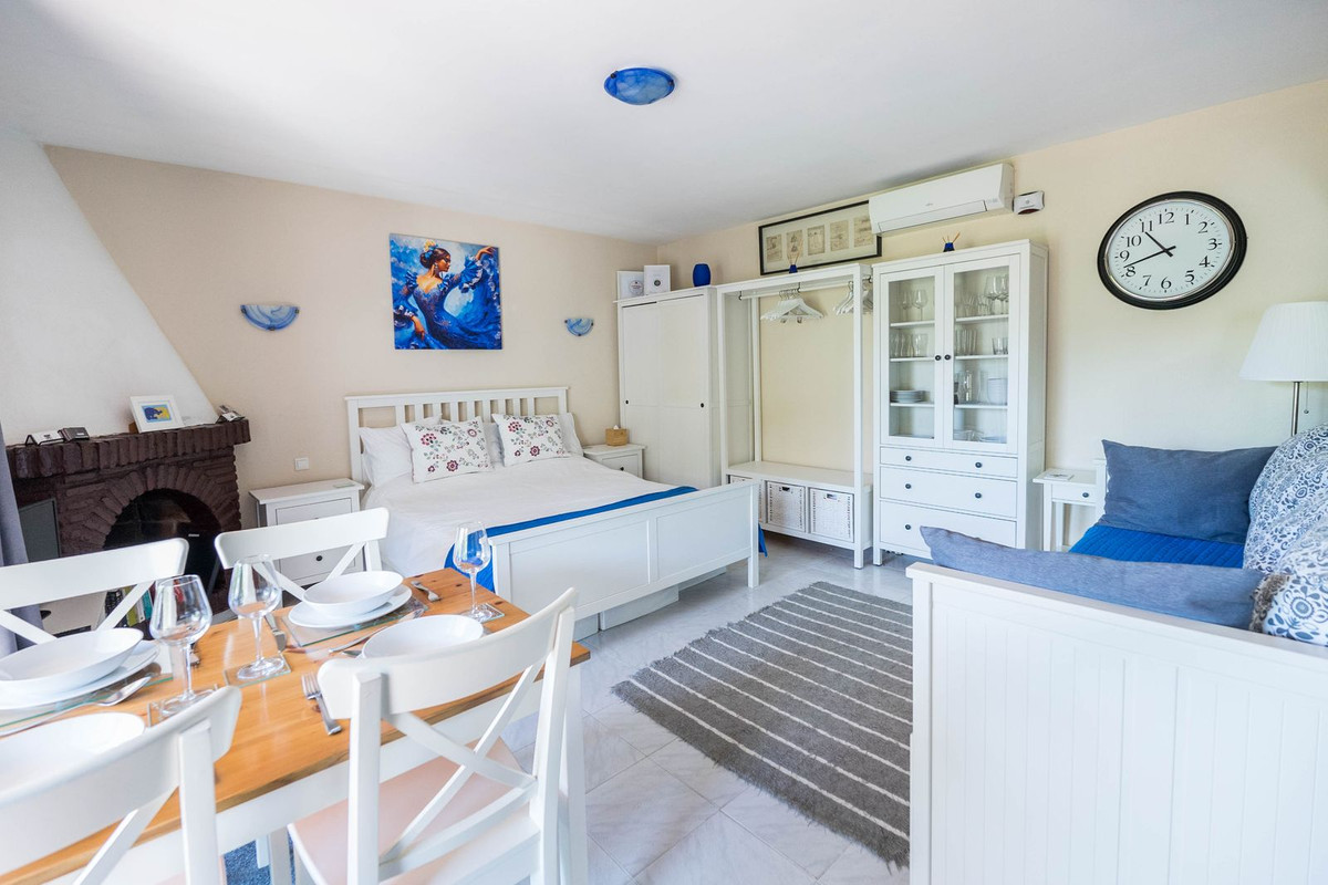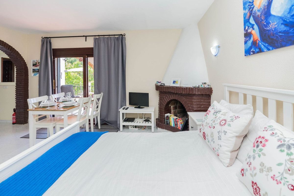 House number 2, is a very spacious studio with a King size bed, sofa bed, fireplace, kitchen, bathroom, south-facing terrace, barbecue and sea views!