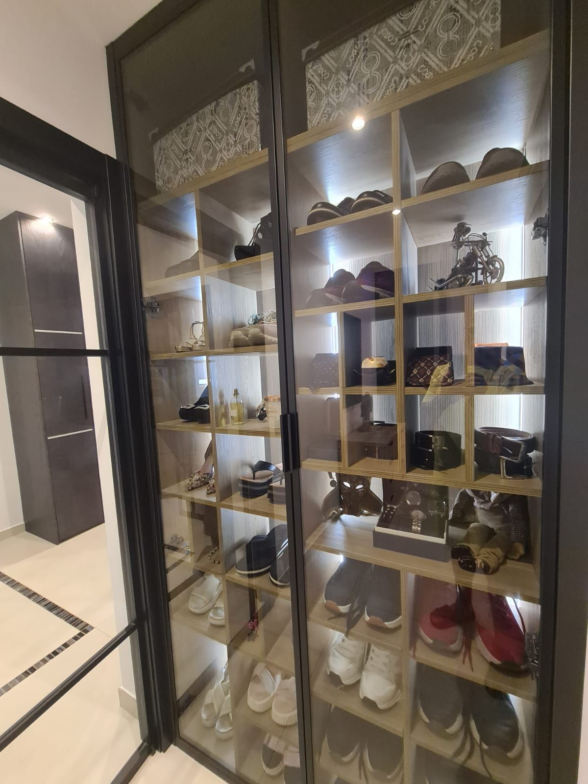 Master suite with dark glass illuminated wardrobe and shoe organiser. Modern bathroom with elegant bathtub and walk-in shower.