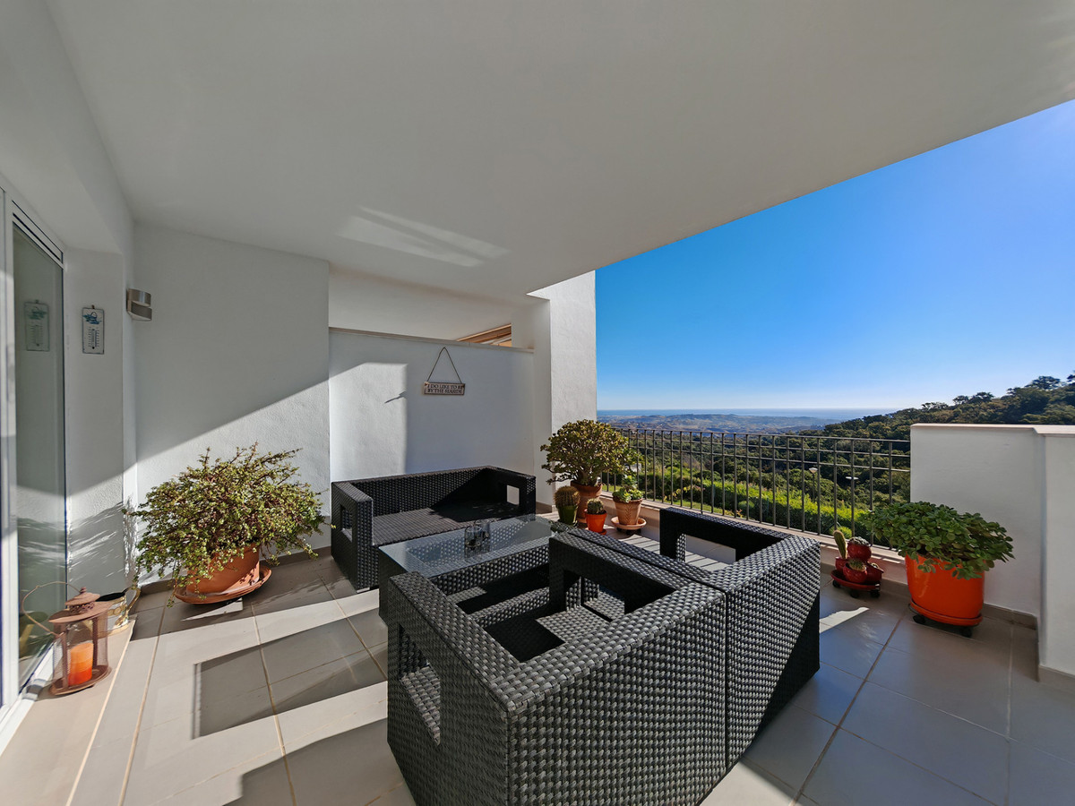Apartment for sale in La Mairena, Marbella with 2 bedrooms, 2 bathrooms, 1 on suite bathroom and with orientation south, with communal swimming pool, private garage (1 parking spaces) and communal garden. Regarding property dimensions, it has 93.75 m² built and 29.65 m² terrace. Has the following facilities mountainside, air conditioning, fully furnished, fully fitted kitchen, utility room, gym, security entrance, double glazing, video entrance, private terrace, water tank, sea view, country view, mountain view, golf view, internet - wi-fi, covered terrace, fitted wardrobes, gated community, lift, garden view, panoramic view, uncovered terrace, balcony, spa, wheelchair-accessible and excellent condition.