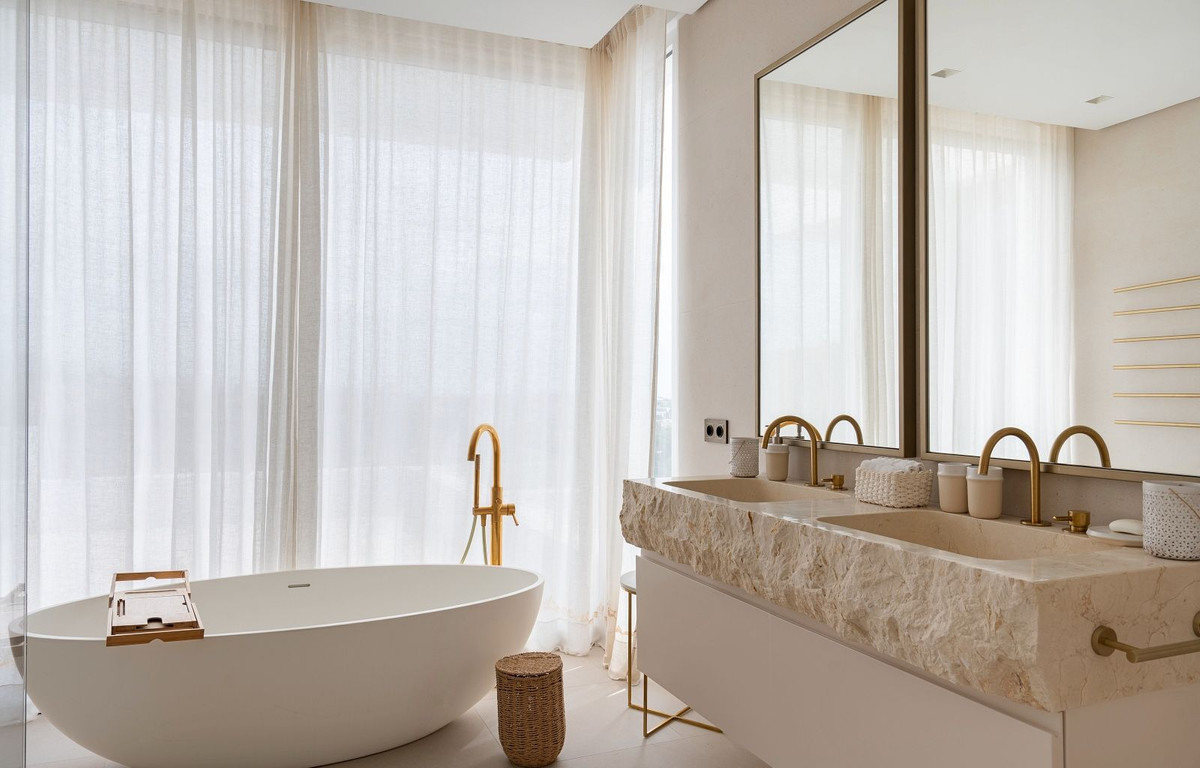 The first floor hosts two additional bedrooms, including the luxurious main suite with two walk-in wardrobes and a large bathroom featuring both a walk-in shower and a freestanding bathtub. Both bedrooms enjoy access to a private terrace with panoramic views of the sea, golf course, La Concha and the surrounding landscape.