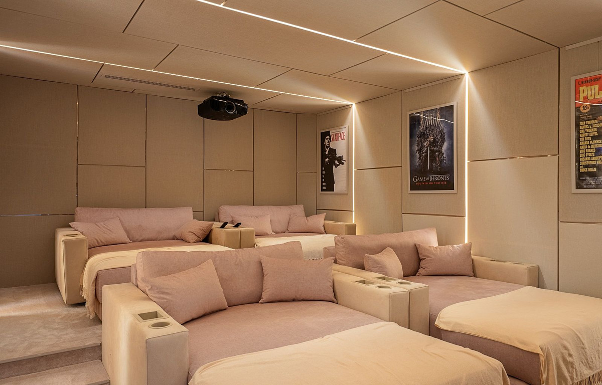 The lower level of the villa provides a fourth bedroom with bathroom, complemented by a variety of leisure facilities. These include a games area, an impressive wine cellar, cinema room, and a fully equipped gym. All three levels of the home are connected by a private lift for added convenience.