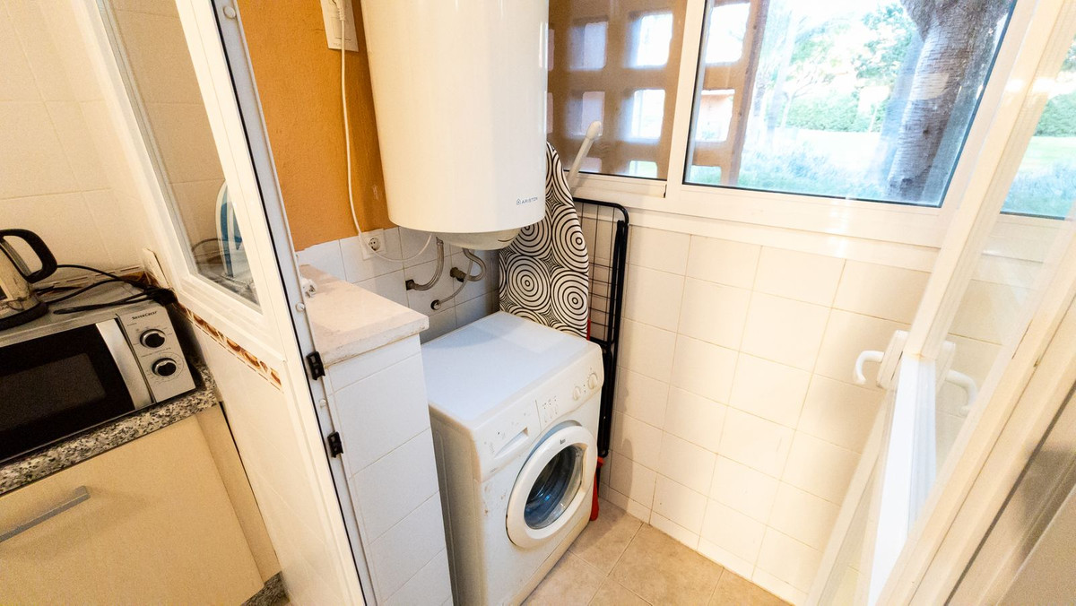 The apartment offers 90 m² built , featuring a bright and functional layout with two bedrooms and two bathrooms, including one en suite. The spacious living room opens onto a 15 m² private, south-west facing covered terrace, perfect for enjoying the sun throughout the day and the beautiful Mediterranean evenings with views of the communal gardens. The fully equipped kitchen includes a separate laundry room and built-in wardrobes for maximum comfort. Additional features include marble floors, air conditioning, fiber optic internet, and accessibility for people with reduced mobility. The property is in excellent condition and can be delivered fully furnished.