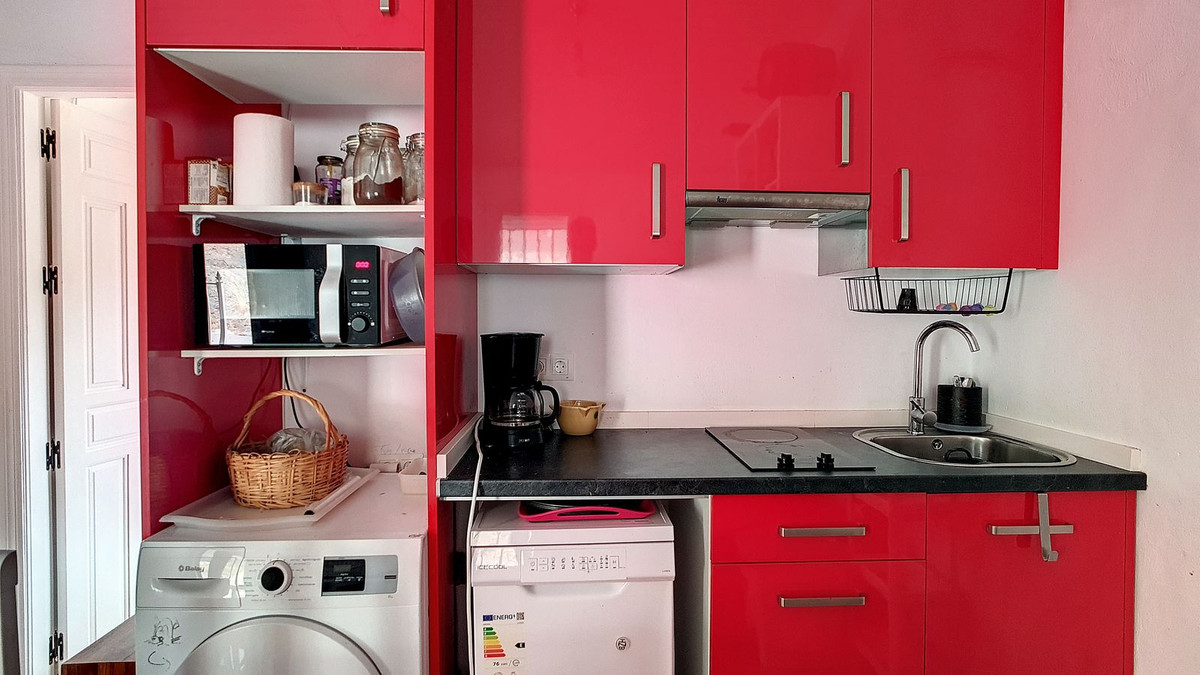A spacious veranda with a fully equipped kitchen and dining area, leading into a cozy lounge with air conditioning and a pellet stove. From here, you access two bedrooms and a bathroom (shower, toilet, and washbasin).