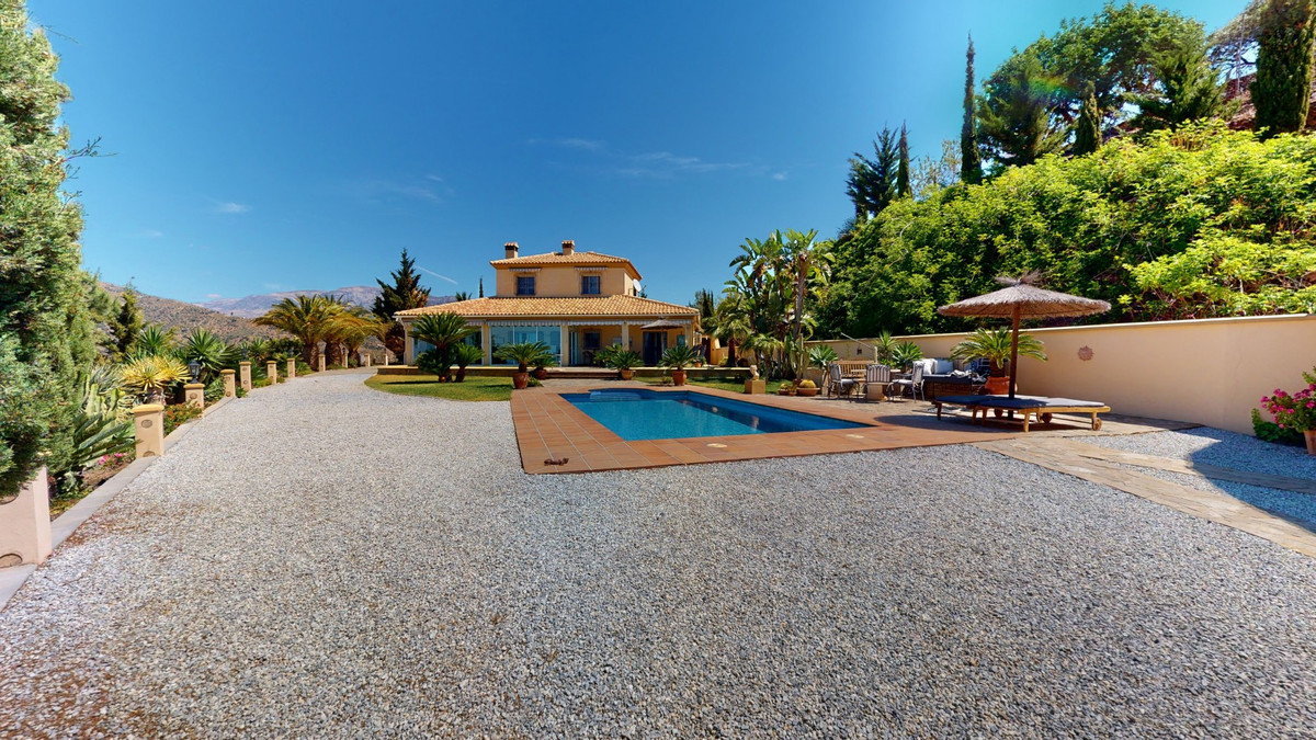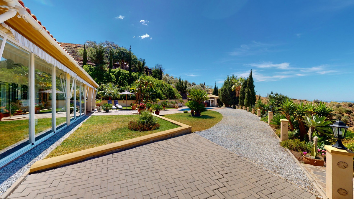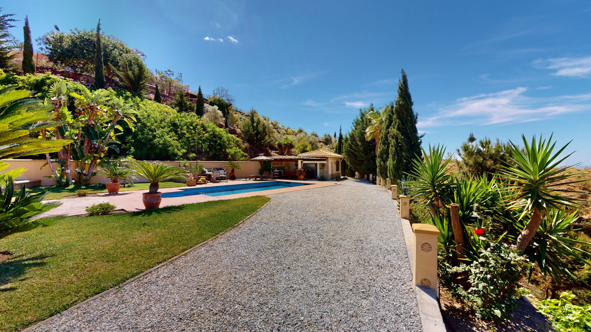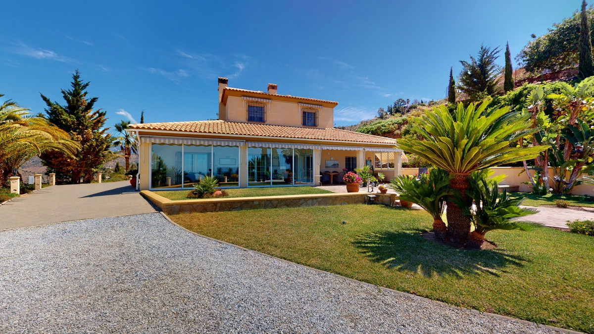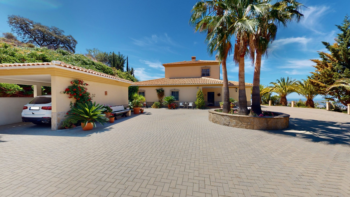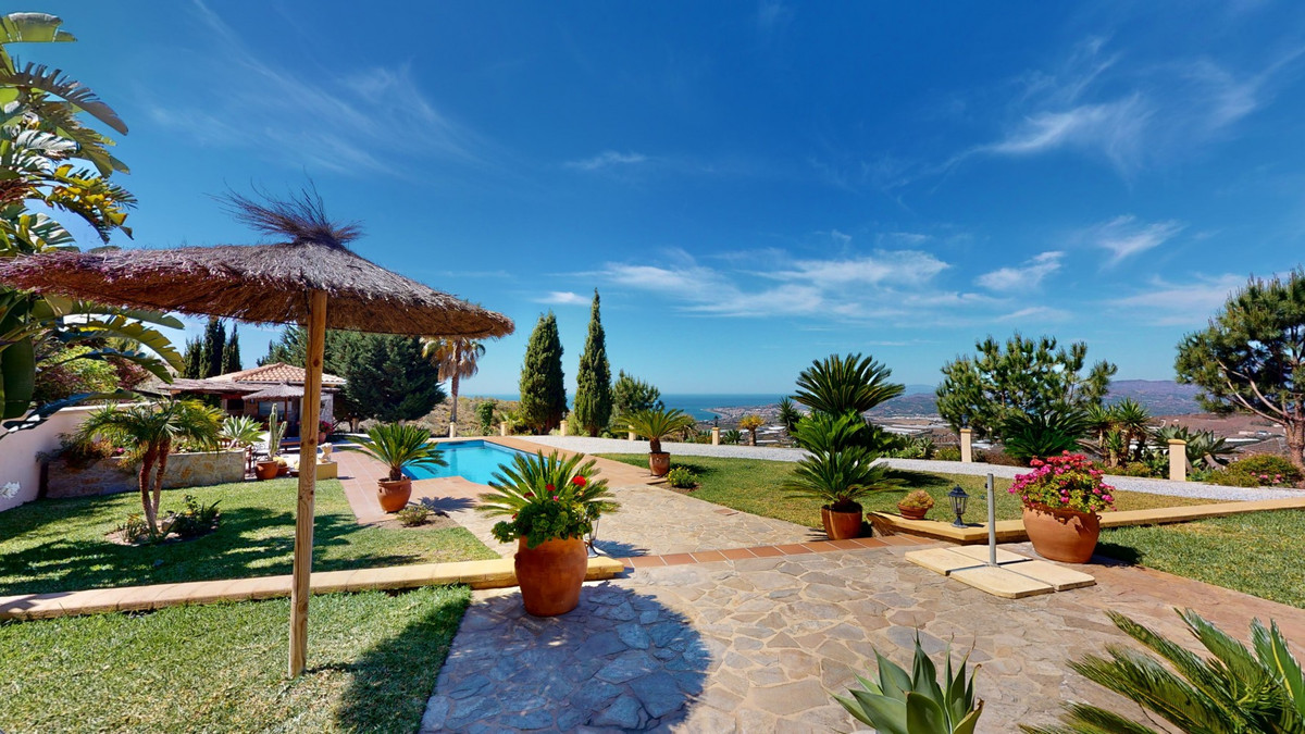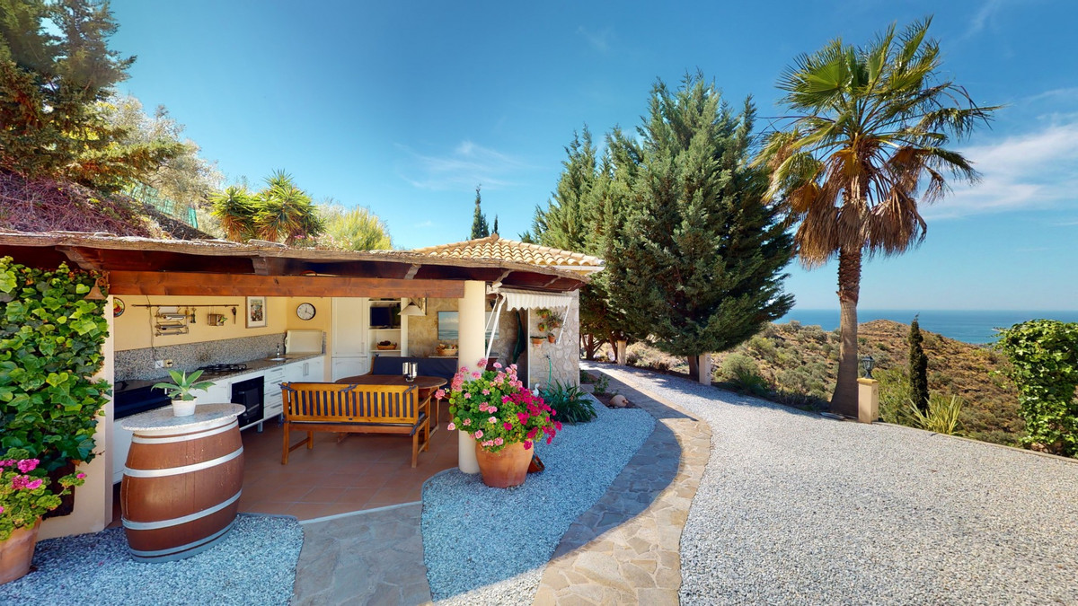 The perfect view paired with the right southwest orientation, which together gives the superlative to absolute happiness. A villa which leaves nothing to be desired, built to a very high standard with an incomparable beautiful garden with spa, sauna and pool, a luxurious outdoor kitchen with integrated dining area. All this and more is offered by this unique villa, located between Algarrobo and Sayalonga. Due to its exposed location, in addition to absolute privacy, you have the romantic view of the setting sun - partly over the Mediterranean Sea and sometimes - depending on the season - over the fabulous mountain landscape of Málaga. Over an asphalted, with pines lined private access road one reaches the imposing entrance area of the property , where a palm island is in the midst of rondel. There are several parking spaces and a garage plus a large carport. On the first floor of the villa is the living room with separate fireplace room, a guest toilet and laundry room, a modern kitchen with access to the very spacious conservatory, which lacks nothing. Further, on the first floor there is a really nice bedroom with a bathroom on suite. On the upper floor of the villa is the master bedroom with a spacious bathroom on-suite , as well as an attached dressing room. The property is equipped with central heating, air conditioning and a fireplace. On the plot are planted a variety of fruit trees, palm trees , tropical plants and pine trees. 15 minutes to the beach and the sea, as well as the golf course and marina of Caleta - and only 40 minutes drive to the airport of Málaga. We are pleased to be able to present this dream property to you soon, either personally or via virtual viewing. Because this world, it is unique - just like our Axarquía. In Andalusia. On the Costa del Sol. Here, on the sunny side of life...