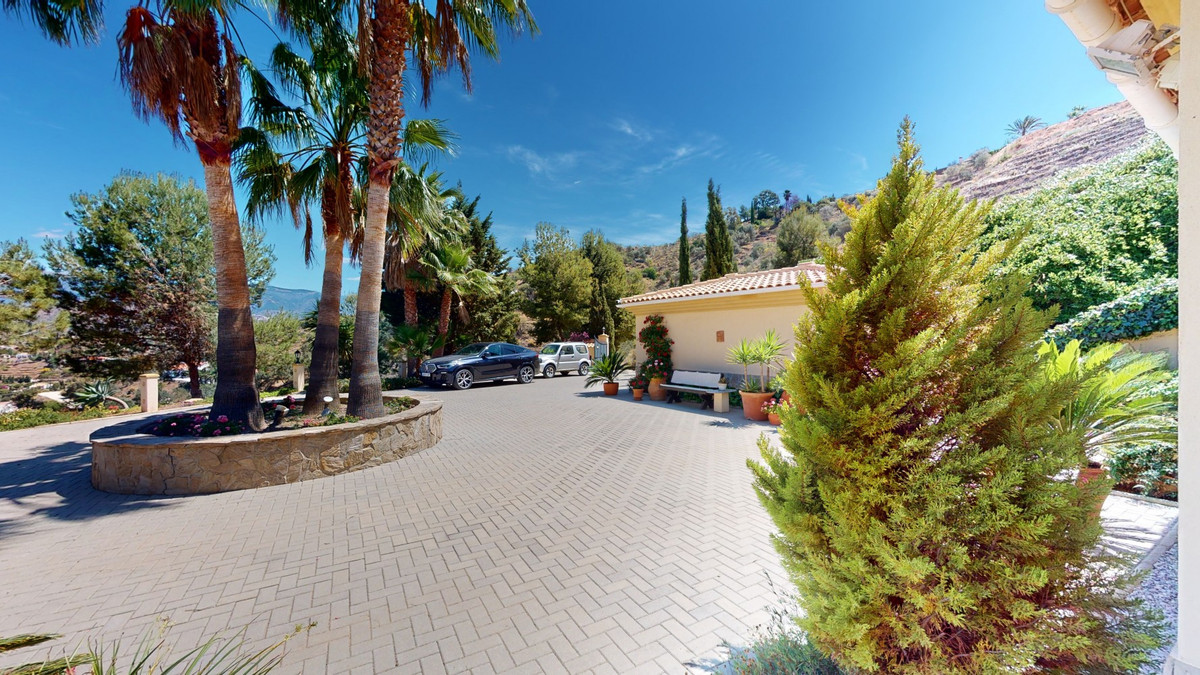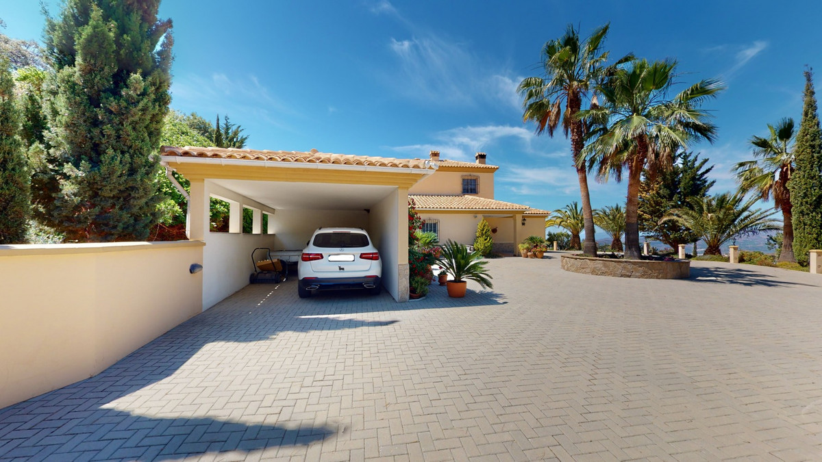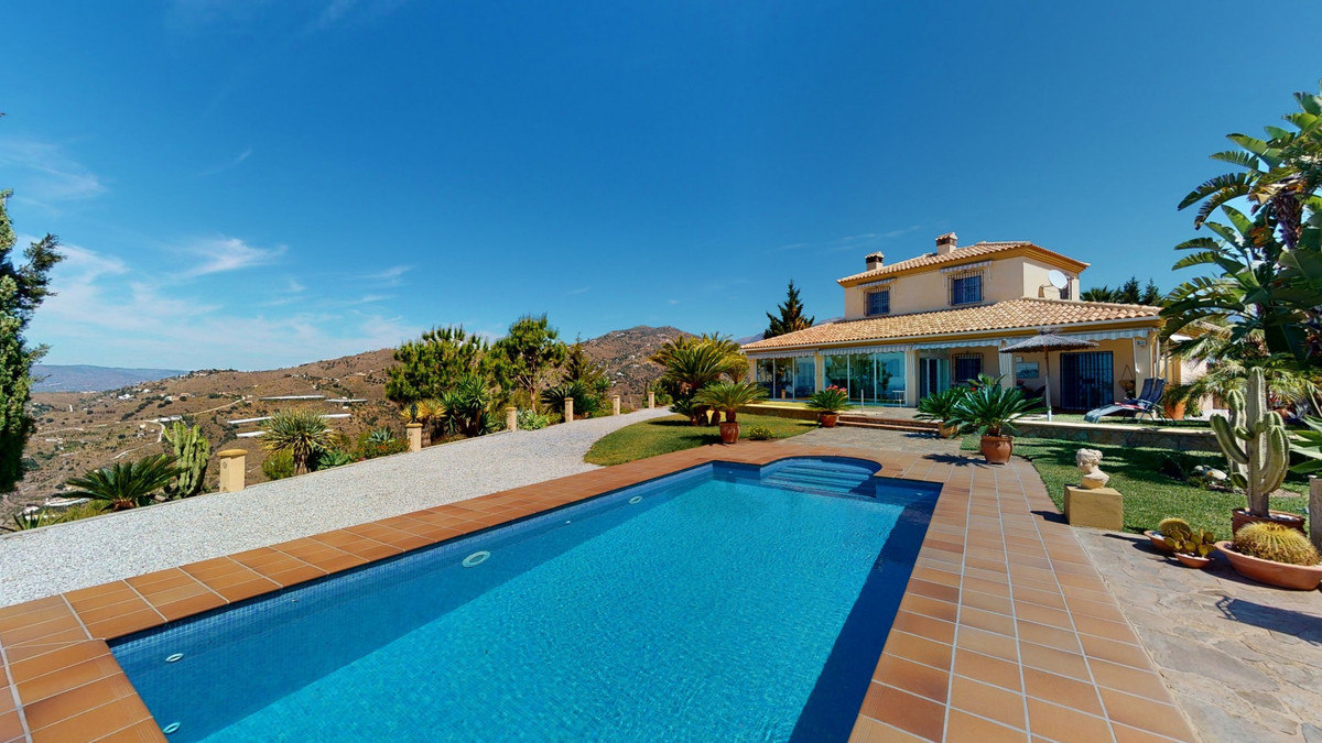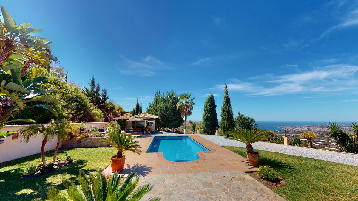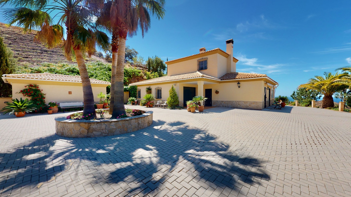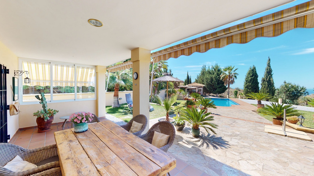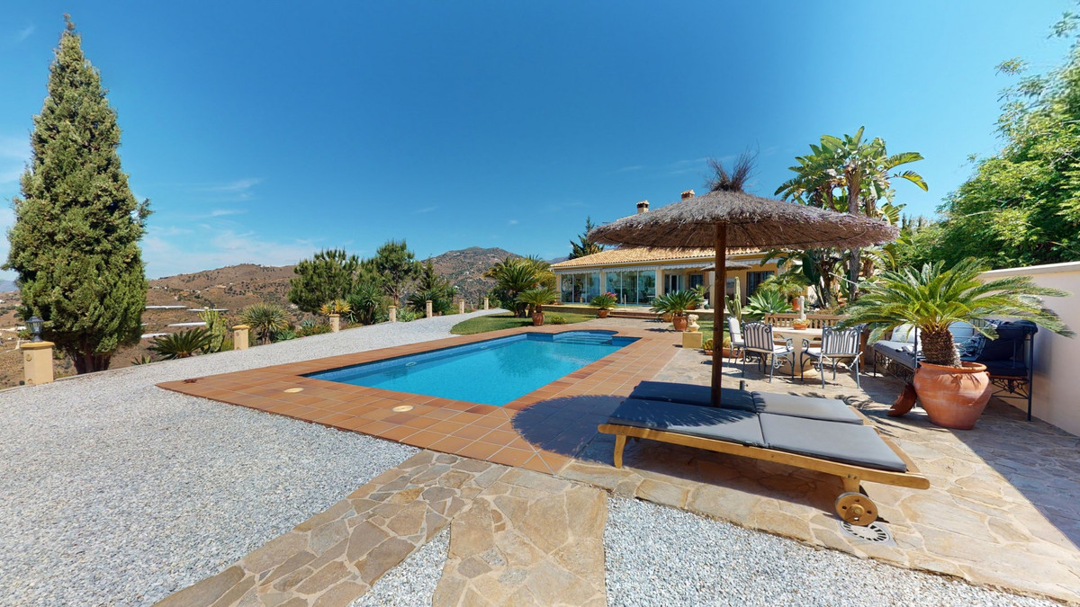 The perfect view paired with the right southwest orientation, which together gives the superlative to absolute happiness. A villa which leaves nothing to be desired, built to a very high standard with an incomparable beautiful garden with spa, sauna and pool, a luxurious outdoor kitchen with integrated dining area. All this and more is offered by this unique villa, located between Algarrobo and Sayalonga. Due to its exposed location, in addition to absolute privacy, you have the romantic view of the setting sun - partly over the Mediterranean Sea and sometimes - depending on the season - over the fabulous mountain landscape of Málaga. Over an asphalted, with pines lined private access road one reaches the imposing entrance area of the property , where a palm island is in the midst of rondel. There are several parking spaces and a garage plus a large carport. On the first floor of the villa is the living room with separate fireplace room, a guest toilet and laundry room, a modern kitchen with access to the very spacious conservatory, which lacks nothing. Further, on the first floor there is a really nice bedroom with a bathroom on suite. On the upper floor of the villa is the master bedroom with a spacious bathroom on-suite , as well as an attached dressing room. The property is equipped with central heating, air conditioning and a fireplace. On the plot are planted a variety of fruit trees, palm trees , tropical plants and pine trees. 15 minutes to the beach and the sea, as well as the golf course and marina of Caleta - and only 40 minutes drive to the airport of Málaga. We are pleased to be able to present this dream property to you soon, either personally or via virtual viewing. Because this world, it is unique - just like our Axarquía. In Andalusia. On the Costa del Sol. Here, on the sunny side of life...
