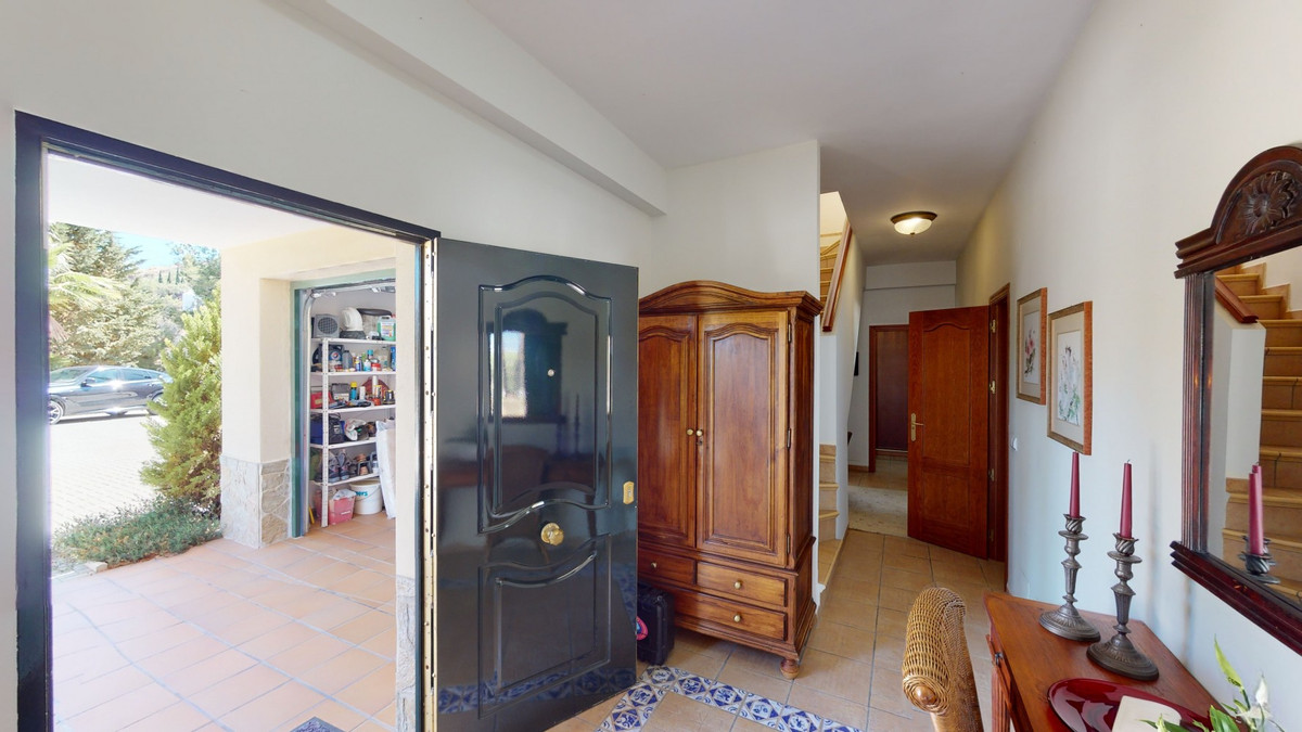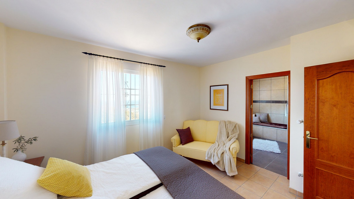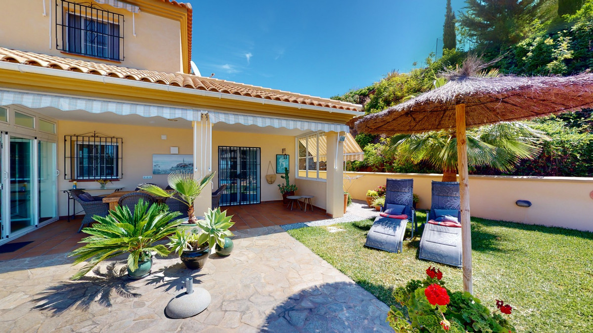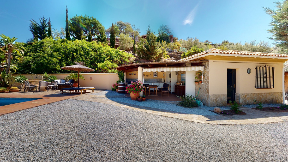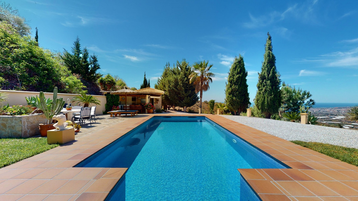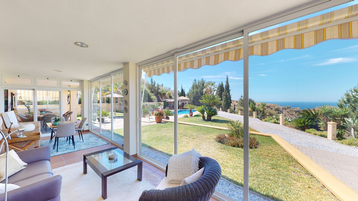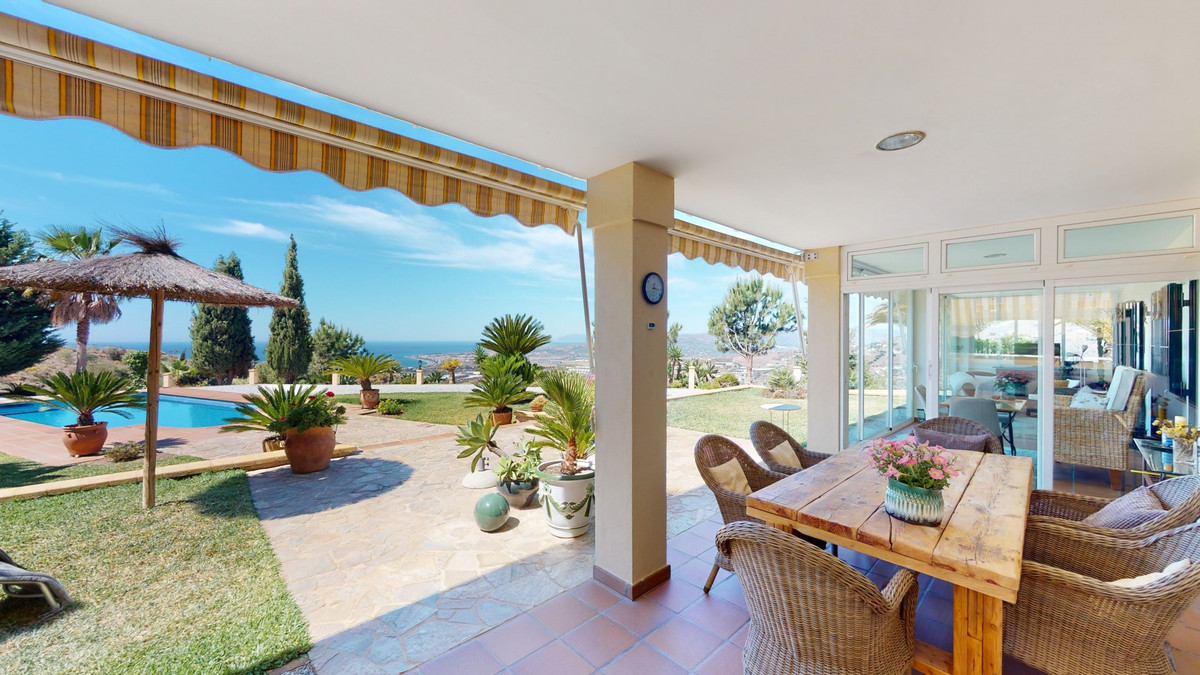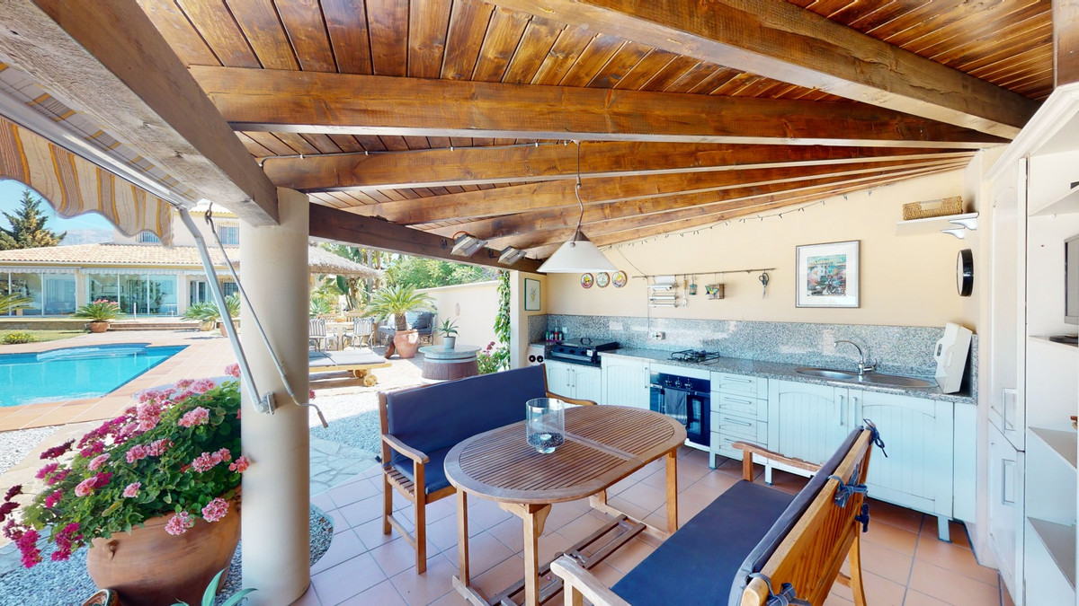 The perfect view paired with the right southwest orientation, which together gives the superlative to absolute happiness. A villa which leaves nothing to be desired, built to a very high standard with an incomparable beautiful garden with spa, sauna and pool, a luxurious outdoor kitchen with integrated dining area. All this and more is offered by this unique villa, located between Algarrobo and Sayalonga. Due to its exposed location, in addition to absolute privacy, you have the romantic view of the setting sun - partly over the Mediterranean Sea and sometimes - depending on the season - over the fabulous mountain landscape of Málaga. Over an asphalted, with pines lined private access road one reaches the imposing entrance area of the property , where a palm island is in the midst of rondel. There are several parking spaces and a garage plus a large carport. On the first floor of the villa is the living room with separate fireplace room, a guest toilet and laundry room, a modern kitchen with access to the very spacious conservatory, which lacks nothing. Further, on the first floor there is a really nice bedroom with a bathroom on suite. On the upper floor of the villa is the master bedroom with a spacious bathroom on-suite , as well as an attached dressing room. The property is equipped with central heating, air conditioning and a fireplace. On the plot are planted a variety of fruit trees, palm trees , tropical plants and pine trees. 15 minutes to the beach and the sea, as well as the golf course and marina of Caleta - and only 40 minutes drive to the airport of Málaga. We are pleased to be able to present this dream property to you soon, either personally or via virtual viewing. Because this world, it is unique - just like our Axarquía. In Andalusia. On the Costa del Sol. Here, on the sunny side of life...