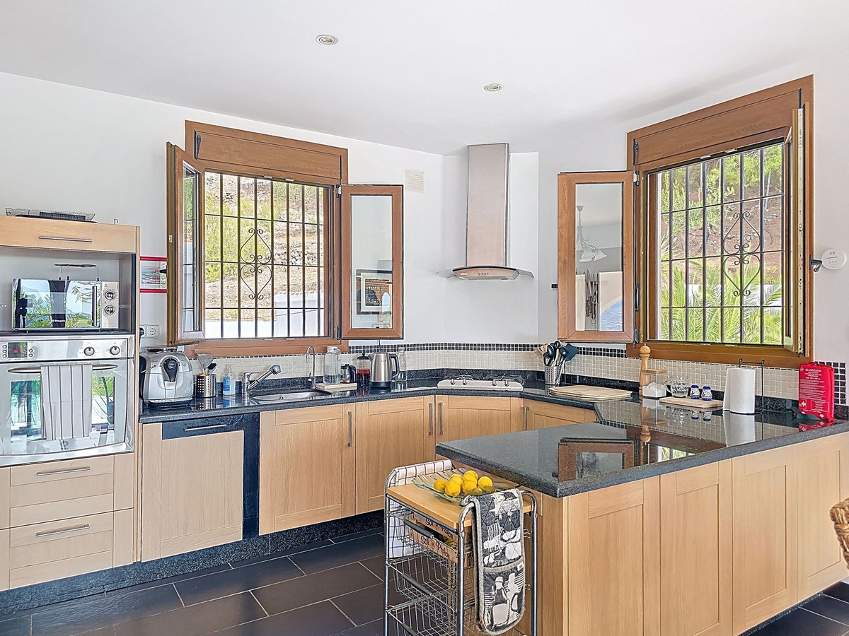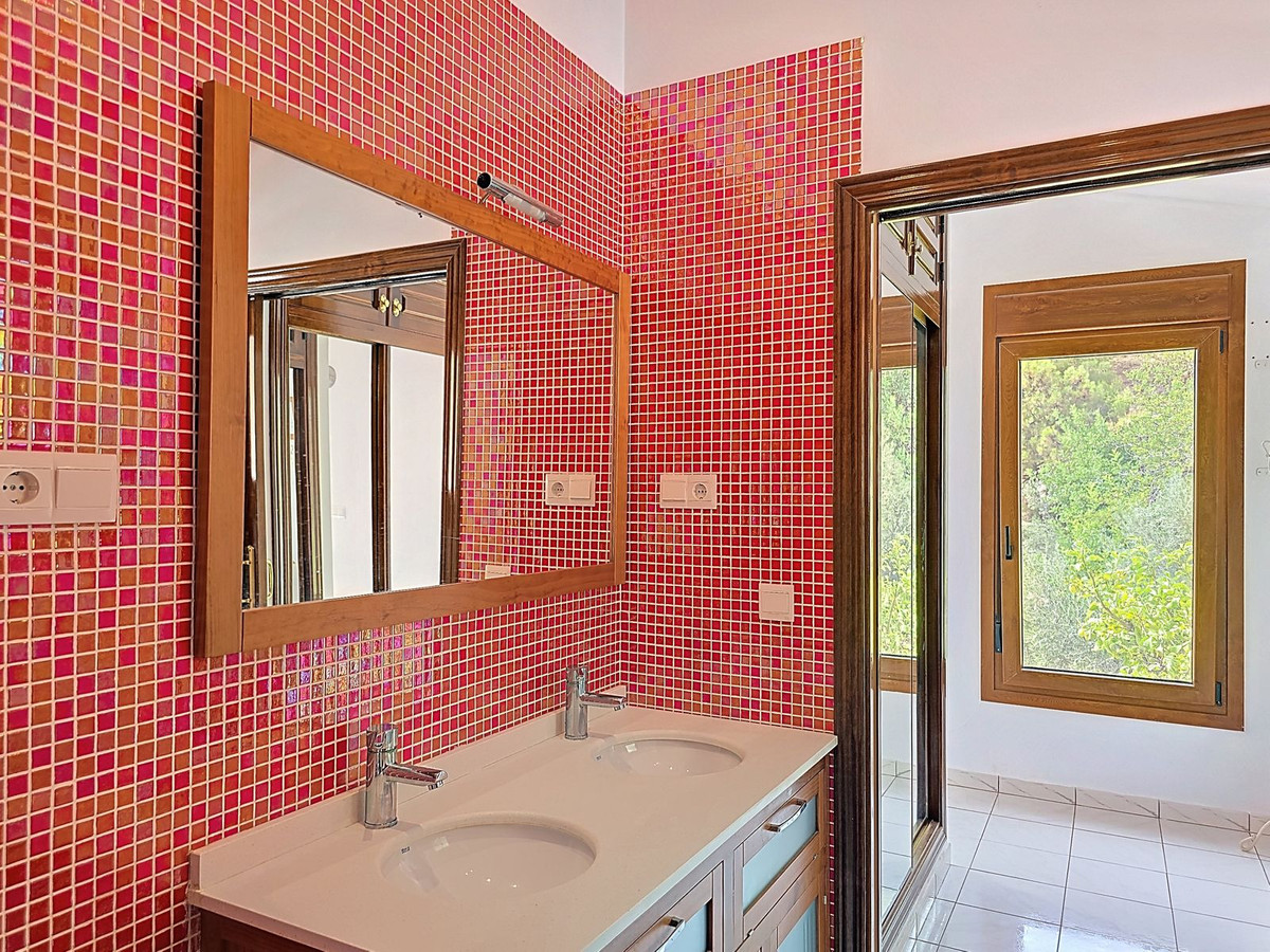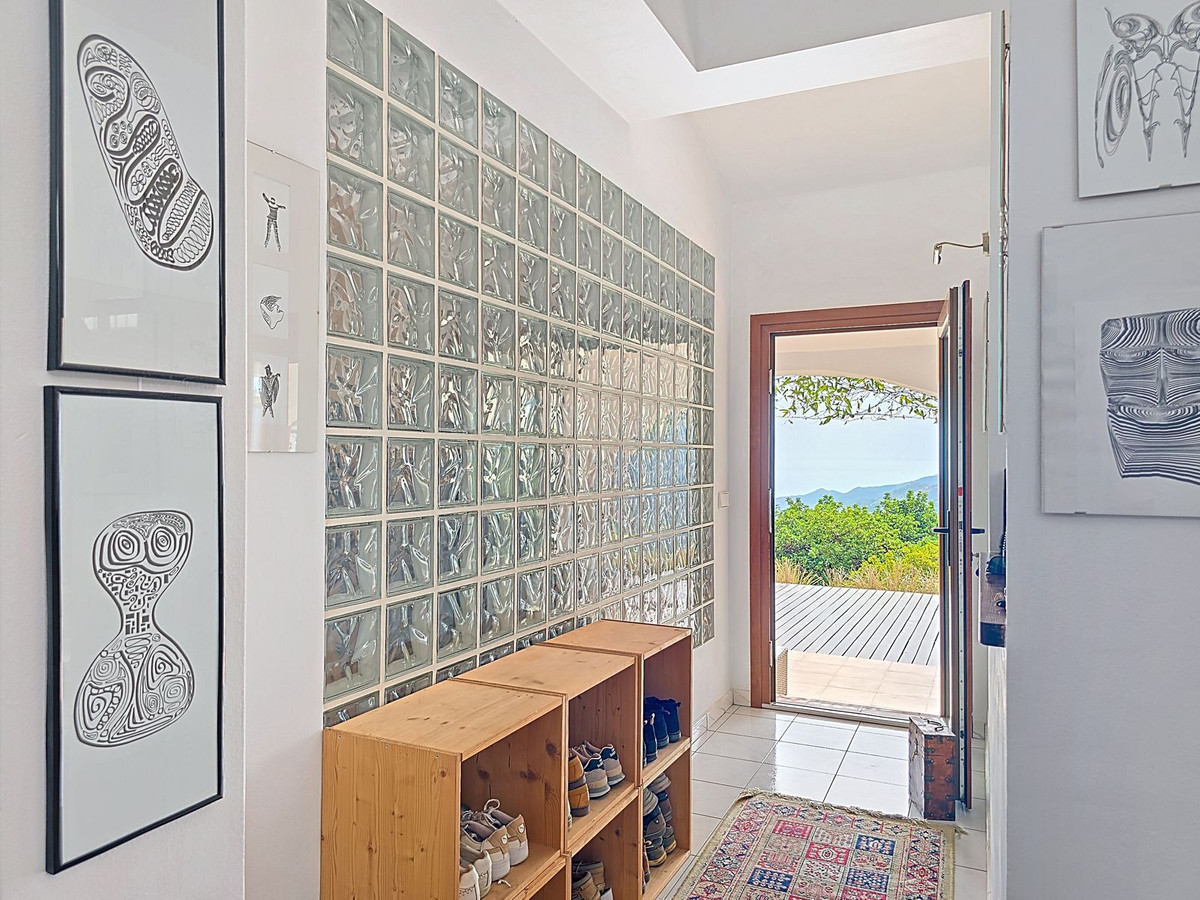 Outdoors, you will find everything for the ultimate Mediterranean lifestyle: a beautifully landscaped garden, several sunny terraces, a heated saltwater pool, and a stylish bar with outdoor kitchen – ideal for long summer evenings and entertaining guests. With a south-facing orientation, you can enjoy the sun all day and breathtaking panoramic sea views over the surrounding landscape.