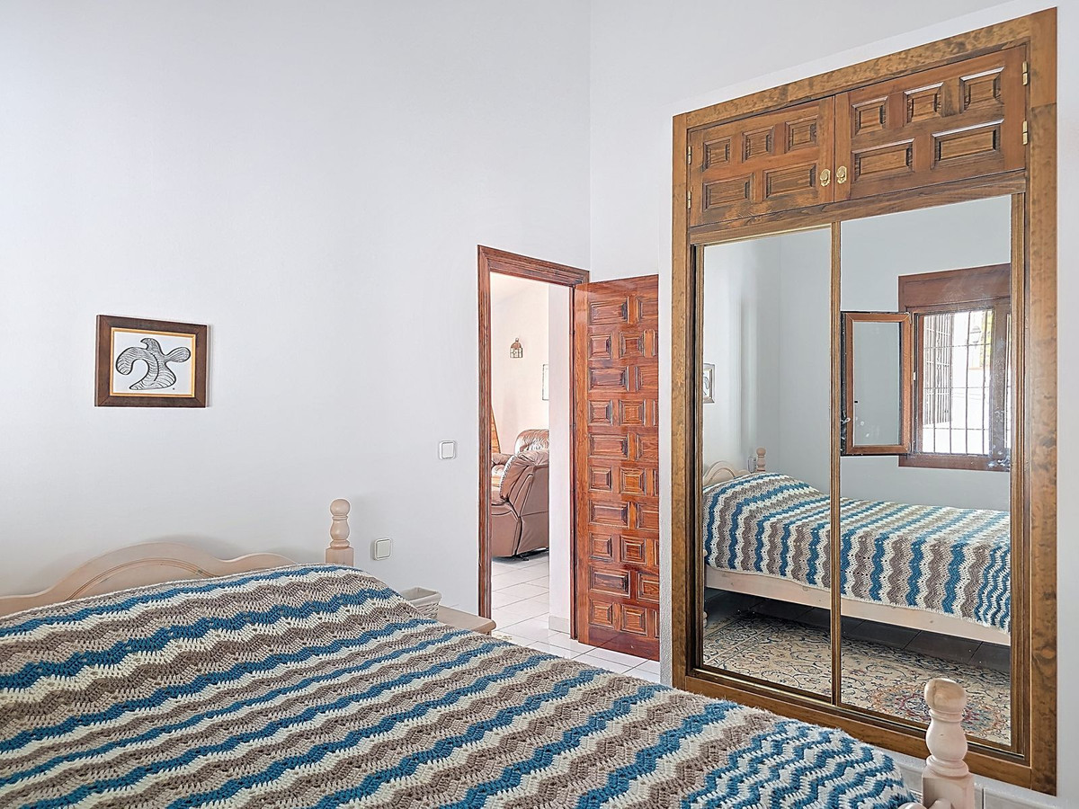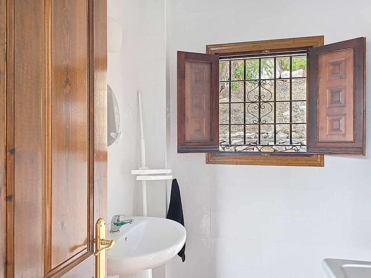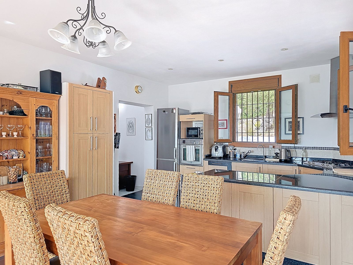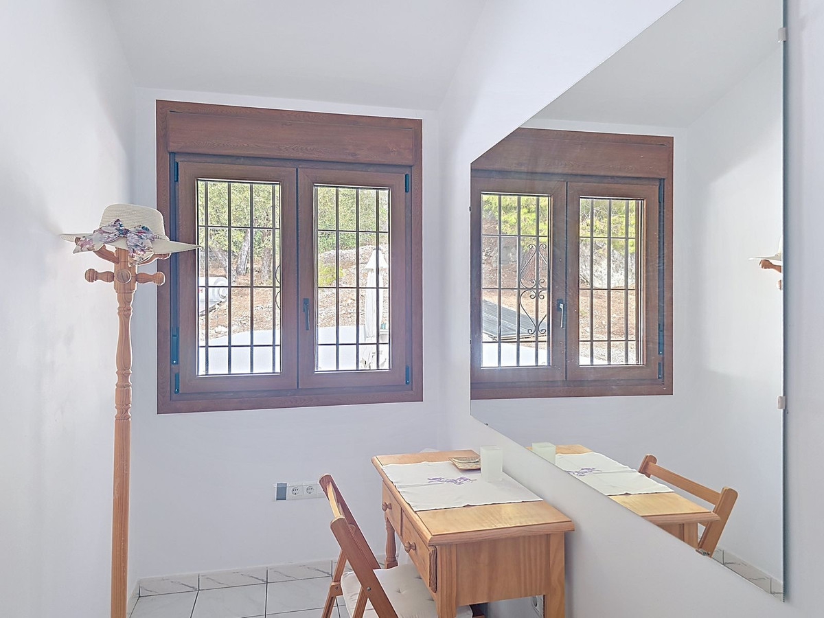 The main house features three spacious bedrooms, including one with an en-suite bathroom, and a total of three bathrooms. The bright living room with fireplace and direct access to the terraces forms the heart of the home. Additionally, there is a separate laundry room with office space, perfect for practical use or working comfortably from home.