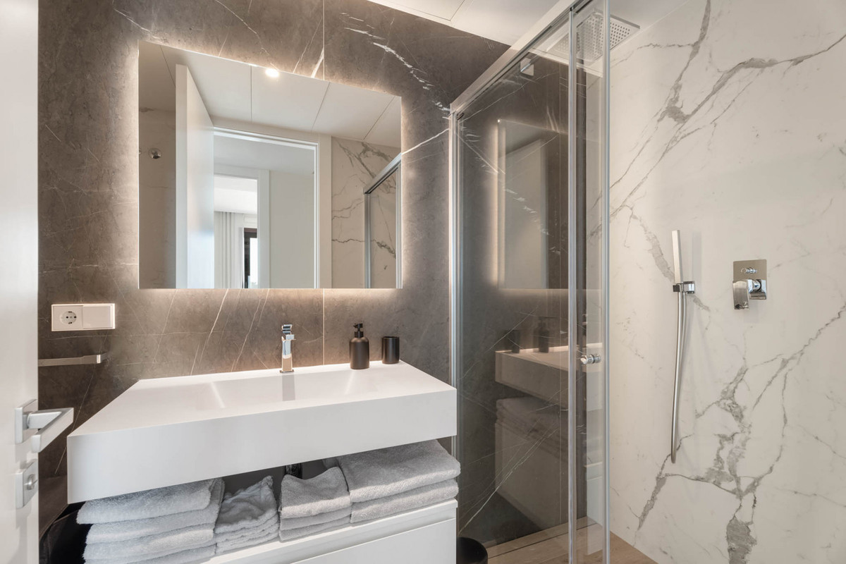 La cuisine est entièrement équipée d'appareils haut de gamme et présente des finitions modernes et épurées. Les deux chambres ont été conçues pour le confort et l'intimité, avec des placards intégrés et de grandes fenêtres. La suite parentale comprend une salle de bains privative et un accès direct à la terrasse, tandis que la seconde chambre bénéficie d'une belle luminosité naturelle et d'une salle de bains attenante.