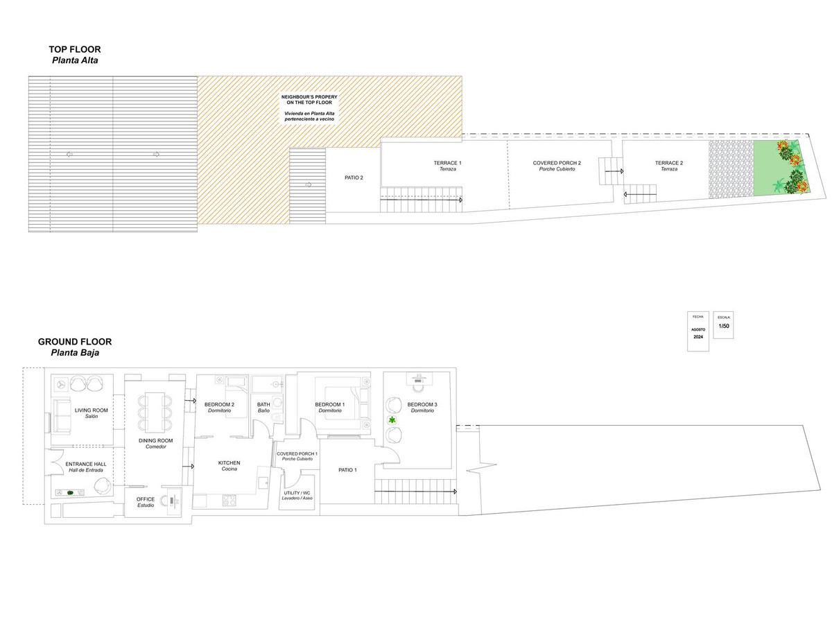 There is also a practical storage room and a large modern bathroom. From the kitchen, you have direct access to the outdoor area, where several relaxing spaces await you: terrace areas, cosy chill-out corners, a garden space, and an outdoor toilet — a true advantage for enjoying the Andalusian climate.