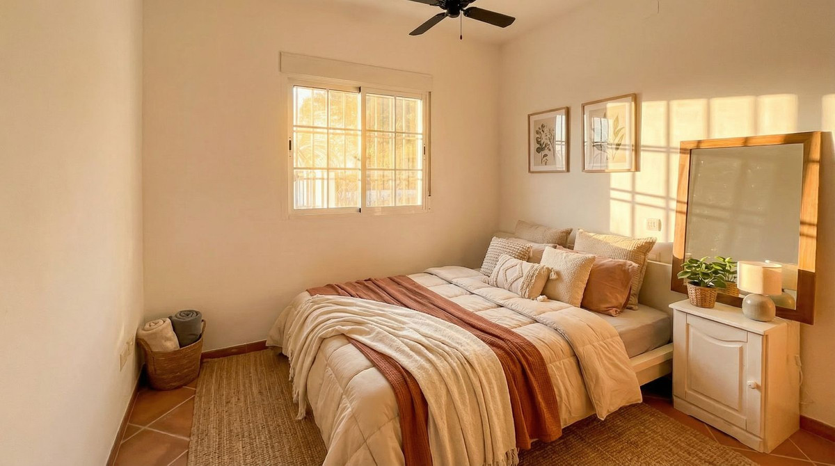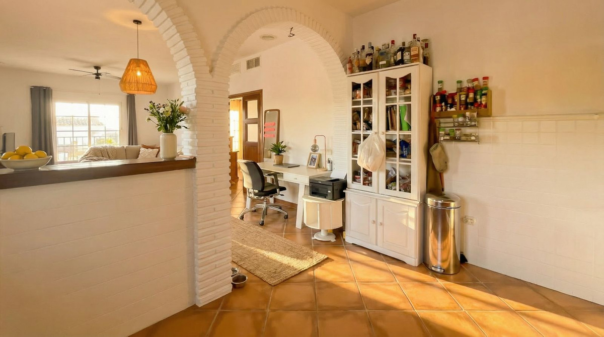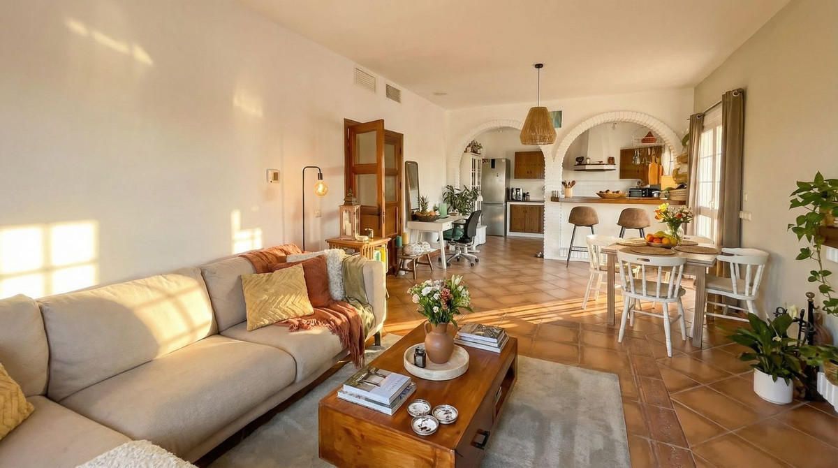 Inside, the villa exudes warm Andalusian charm, with terracotta floors and elegant arches, combined with an open layout that connects directly to the terrace and pool. The living area consists of an open kitchen with breakfast bar and a spacious, inviting living room.