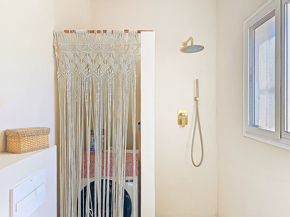 The villa has a living area of 94 m² and comprises three bedrooms, each with air conditioning and built-in wardrobes in Ibiza style. There are two bathrooms with open walk-in showers, including one ensuite bathroom. The fully equipped kitchen is also Ibiza-style and features a refrigerator, freezer, ceramic hob, electric oven, microwave and dishwasher. The bright living room has air conditioning and a cosy fireplace, with direct access to the spacious terrace and swimming pool.