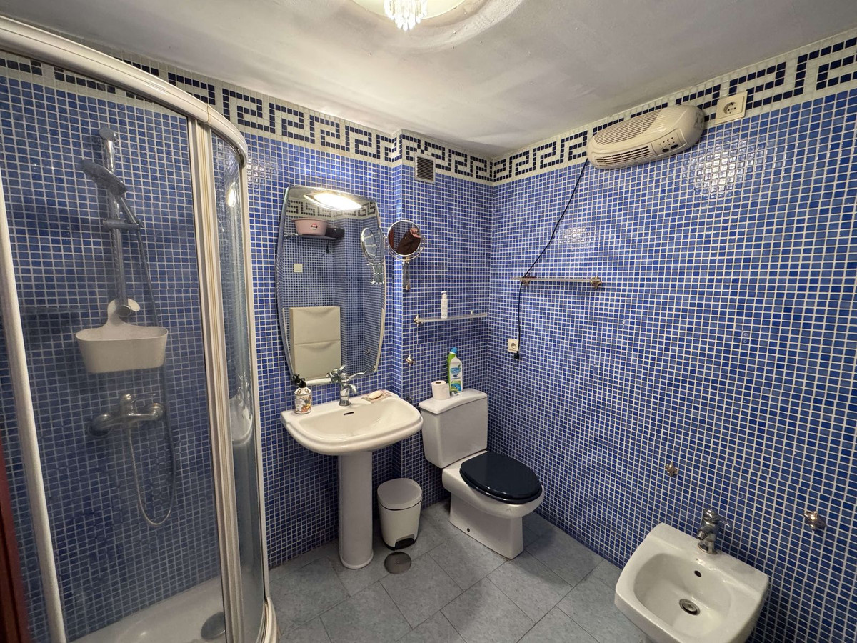 The property offers 120 m² built area (118 m² usable) and is distributed into a spacious and bright living-dining room with fireplace, a fully equipped independent kitchen with utility room, three generously sized bedrooms with fitted wardrobes, and two full bathrooms, one of them en suite featuring a walk-in shower, bidet, toilet and double washbasin. The apartment also benefits from a pleasant glazed terrace and a balcony.