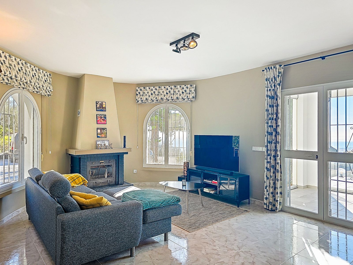 Spacious living area with lounge, dining area and open-plan, fully fitted kitchen, heating with air conditioning, wood-burning stove and electric wall heating