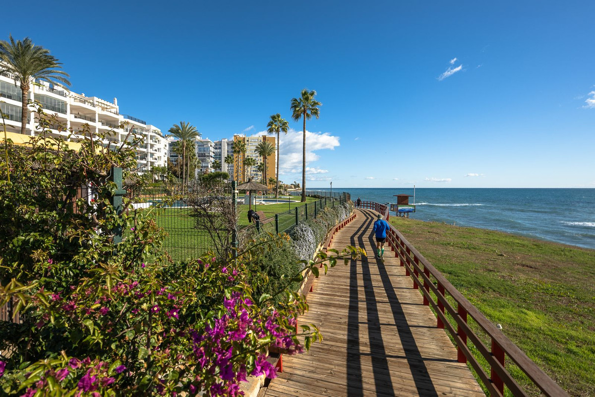 The entire development faces the sea and offers expansive outdoor areas with benches and ample space for sun loungers, whether in shaded areas or full sun. Residents may use their own loungers or rent them directly from the pool bar. The complex features two direct exits to the beachfront promenade, one of which is equipped with a wheelchair- and stroller-friendly ramp. From here, you can enjoy scenic walks stretching from Fuengirola and La Cala de Mijas to Cabopino and Marbella.