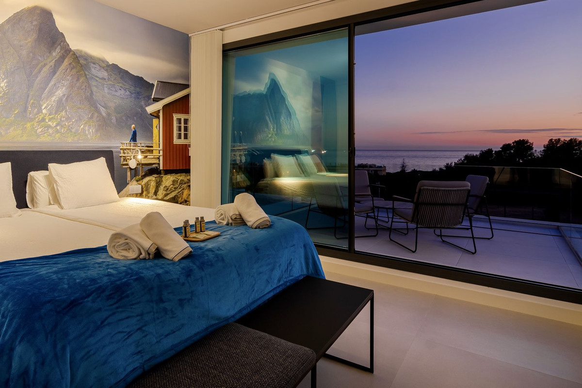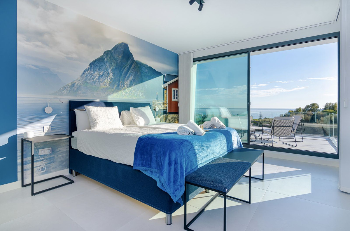 The upper level is dedicated entirely to the master suite, featuring an en-suite bathroom and a private terrace with panoramic sea views.