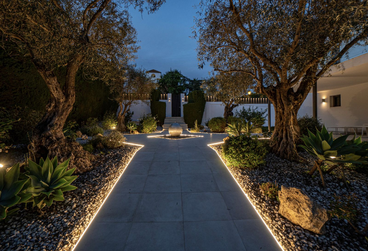 Exclusive villa located in the heart of Nueva Andalucia, renovated with luxury qualities. Privileged location, a short distance from Puerto Banus and the most prestigious golf courses, international schools, sports facilities and services. The house consists of 4 plus 1 bedrooms and 5 bathrooms. Upper floor with great views of the La Concha mountain and residential area, with a large solarium terrace. Open and minimalist spaces abound, along with high security measures, in addition to a beautiful lake with direct access from the garden, and a spacious private pool area, where you can enjoy the tranquility that the area offers.