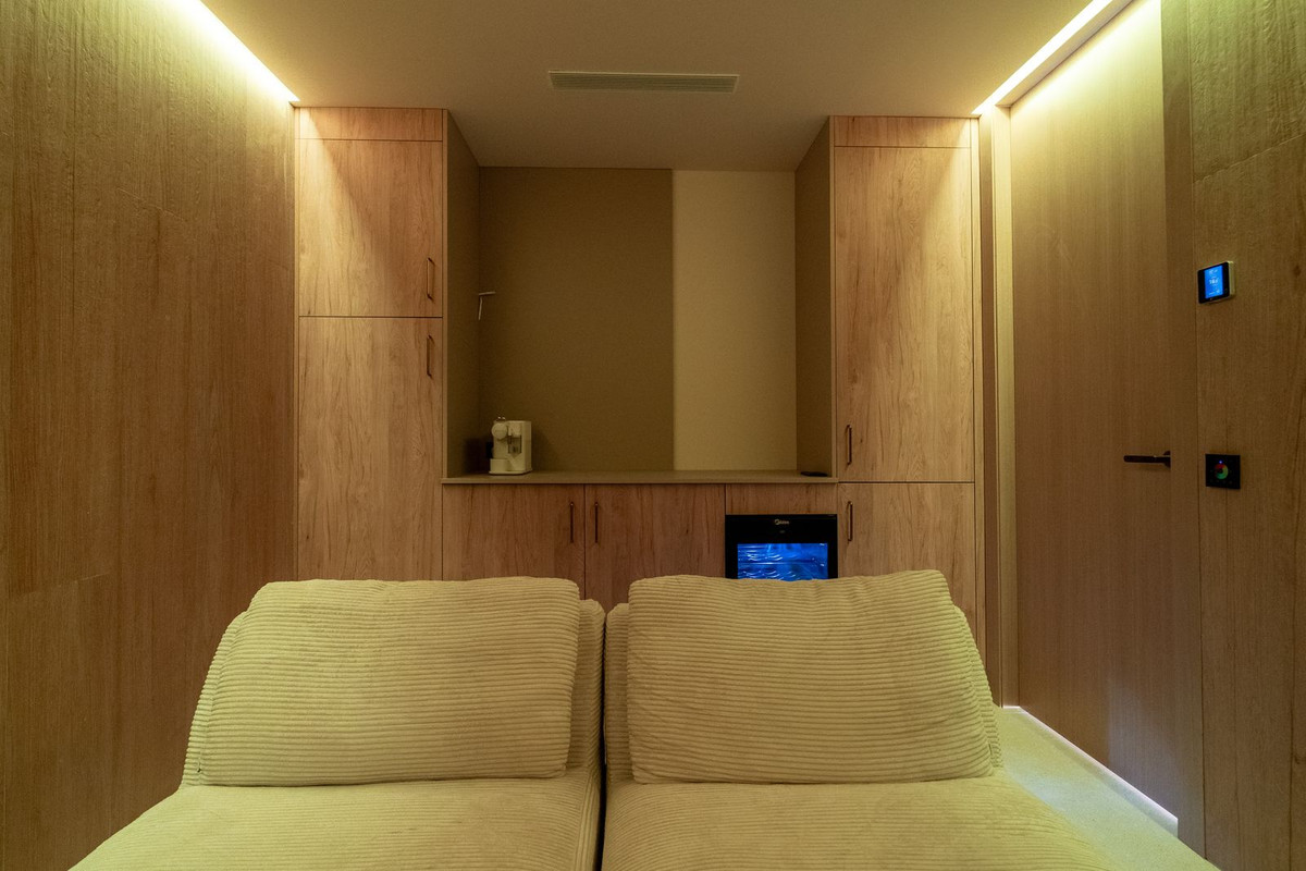 The lower floor includes a second lounge with access to the outdoors, three bedrooms, two bathrooms, a home cinema, sauna, Turkish bath, and gym area. All floors are connected by a glass elevator (to be installed).