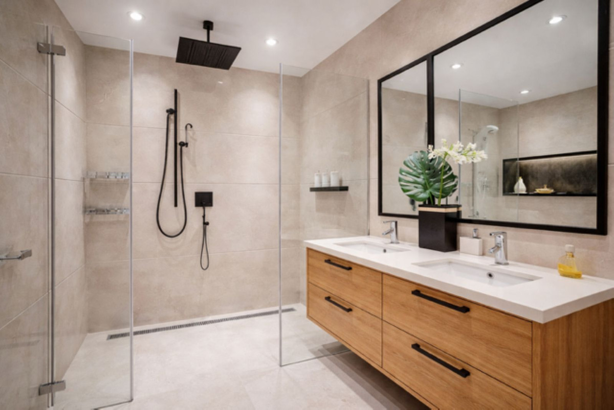 The master bedroom has direct access to the terrace and features an en-suite bathroom with a jacuzzi. The guest bedroom also has a bathroom with a shower.