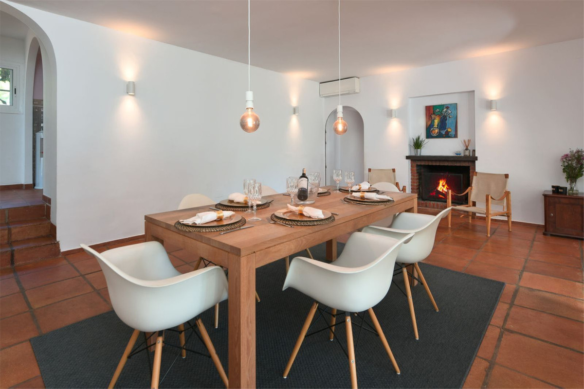 This beautiful hacienda-style villa located in a quiet residential area of Artola Alta and next to Cabopino. Situated only a short walking distance from the natural reserve, Artola Dunes & Beach, Cabopino- Beach & Habour with its restaurants and supermarkets. The villa consists of three bedrooms and two bathrooms, two living rooms and kitchen with a utility room. Its distribution is functional being in one level and ensure privacy due to the master- bedroom & bathroom are separated from the guest- bedrooms & bathroom by the living- and dining areas. The house is private and secluded by a surrounding wall. The property is entered from north by the street via a gate that leads to the patio which gives access to a double garage and a covered entrance to the house. The éntre leads to a fully fitted kitchen and a large dining room. The house opens up towards the garden and pool area via the living room which also gives access to a covered terrace. The the pool area is nestled by a mature and lush tropical garden. The garden boasts several fruit baring trees. The property also have a 20 m2 roof top terrace where you can watch the sea and the sun setting over Marbella bay and La Concha mountain. The property also has a garage of 44 m2