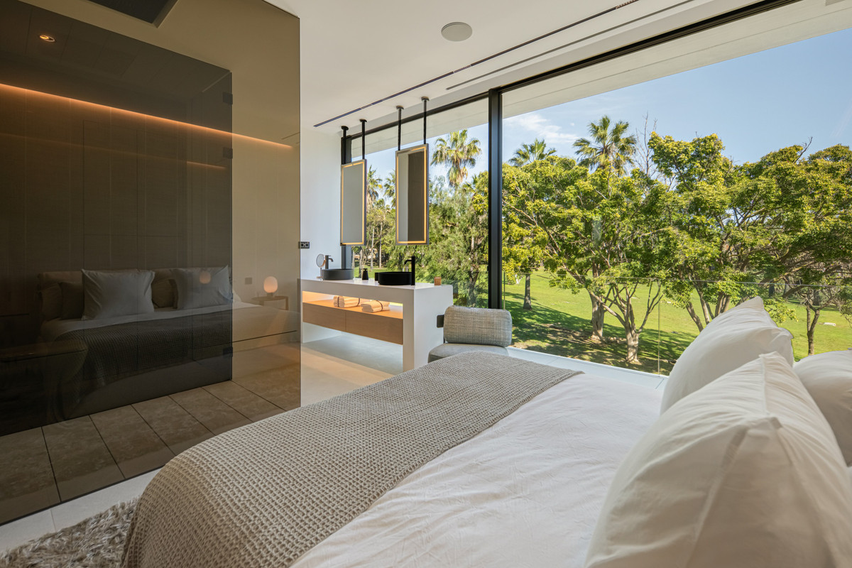 The upper level is dedicated to the bedroom suites. The principal suite stretches across the façade with sea-facing glazing, private terrace access and a sculptural bathroom with freestanding bath and integrated dressing space. Two additional guest suites follow the same understated design language of light stone, clean lines and garden-facing glazing.