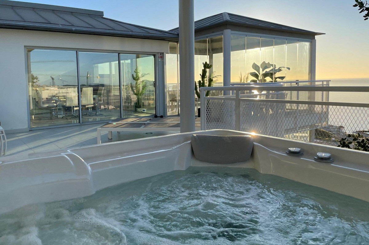 The expansive terrace is seemingly integrated with the indoor area, with an outdoor kitchen and bar, a covered glass dining area completed with a lavish spa/jacuzzi and shower under roof.