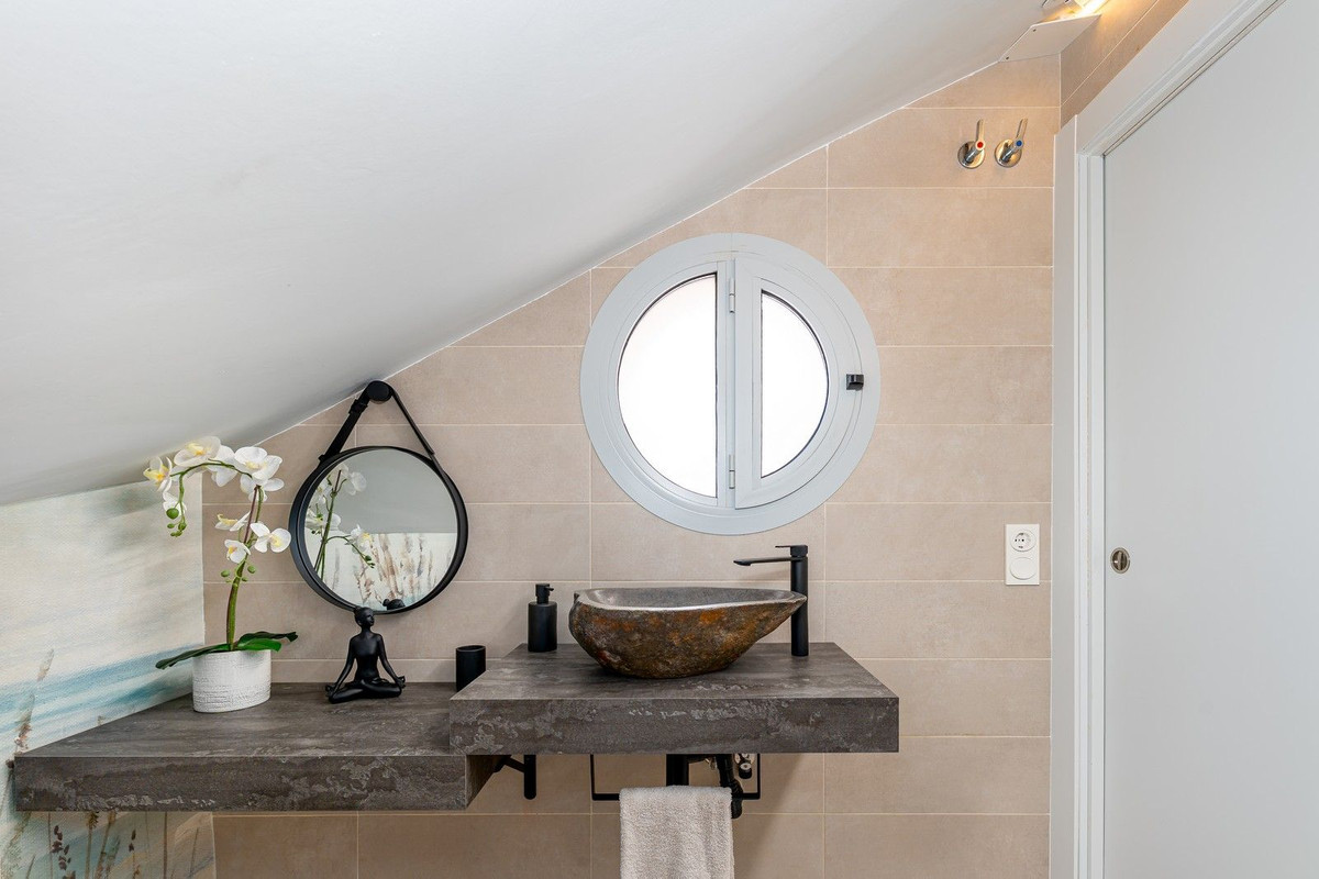 The social heart of the home is a vast, light-filled living and dining area, surrounded by two glass walls and offering breathtaking views. It features a modern Italian kitchen designed for minimalism, using concealed pocket doors to create a streamlined, clutter-free environment.