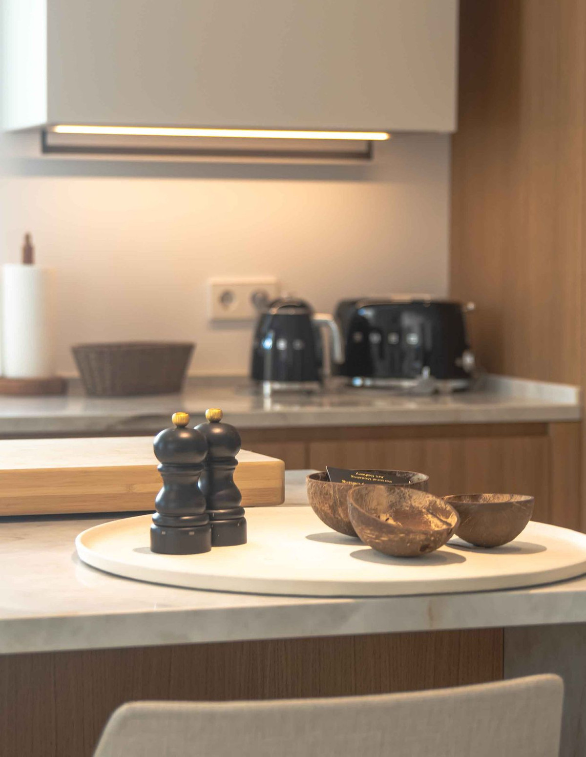 The main living area is arranged as an open-plan environment, where the lounge, dining space and fully fitted kitchen are visually and functionally connected. Large sliding doors extend the interior towards the terrace, reinforcing the relationship between indoor and outdoor areas. The kitchen is designed with integrated appliances and a central island, supporting both everyday use and hosting. Subtle ceiling detailing and material continuity contribute to a calm and cohesive spatial flow.