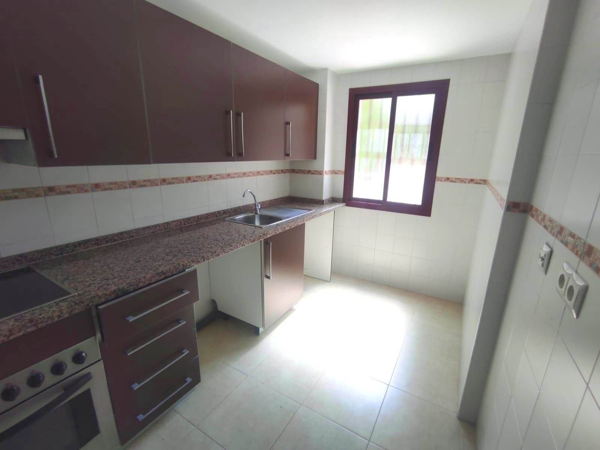 The kitchen is furnished with upper and lower cabinets and includes a ceramic hob, oven, and extractor hood. The apartment also includes built-in wardrobes, a parking space, and access to comprehensive communal areas with a swimming pool and gardens.