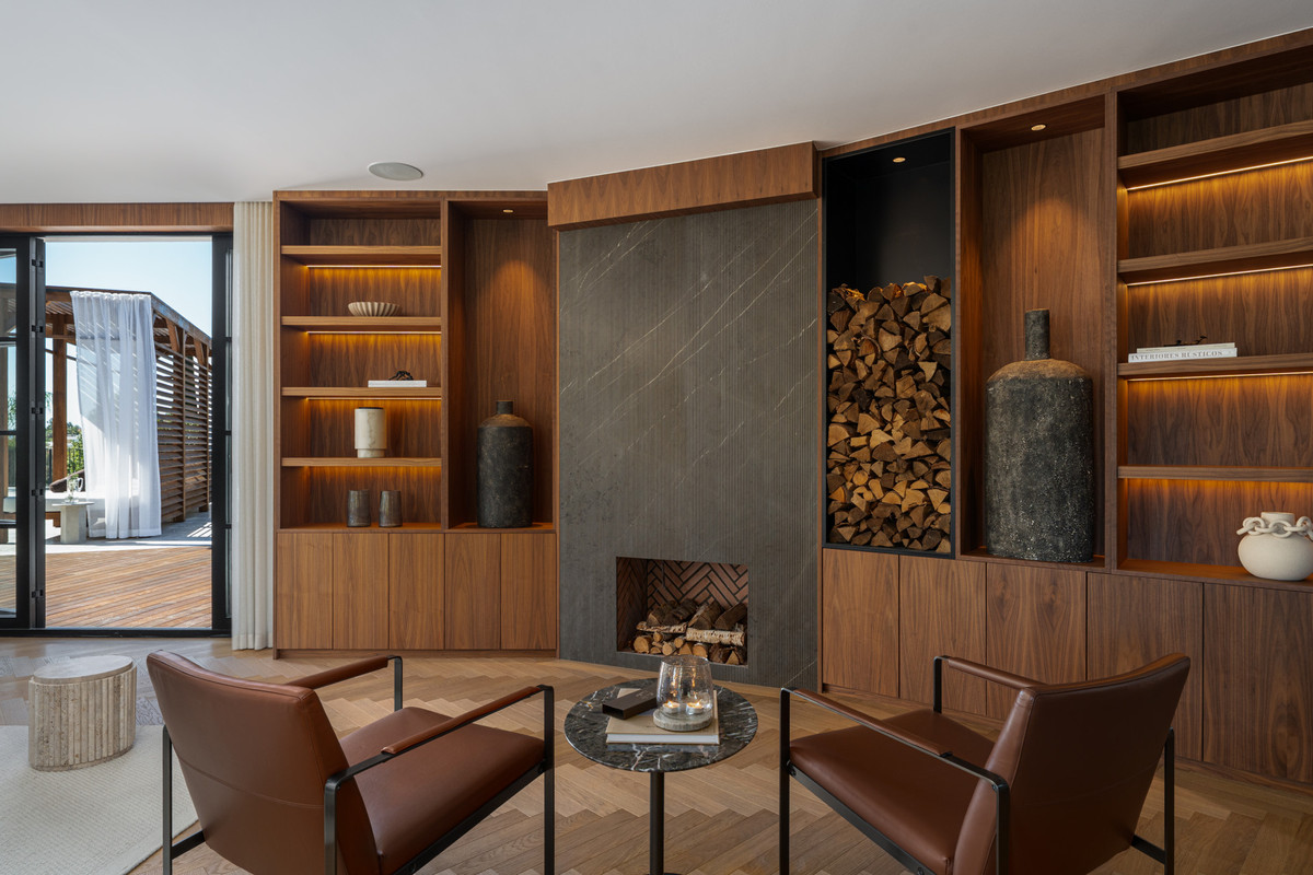 Upstairs, the principal suite benefits from vaulted timber ceilings, open dressing, sculptural stone basins and a walk-in marble shower. Full-height glazing frames the views to the golf and sea, while maintaining privacy. The additional bedrooms follow the same standard of finish and proportion, each thoughtfully designed to maximise comfort. Practical elements, such as a separate utility room, integrated wine storage, custom carpentry and layered lighting, are integrated discreetly throughout.