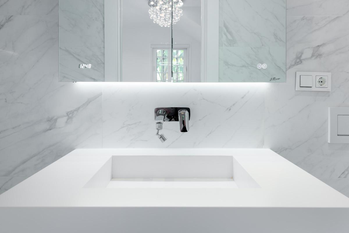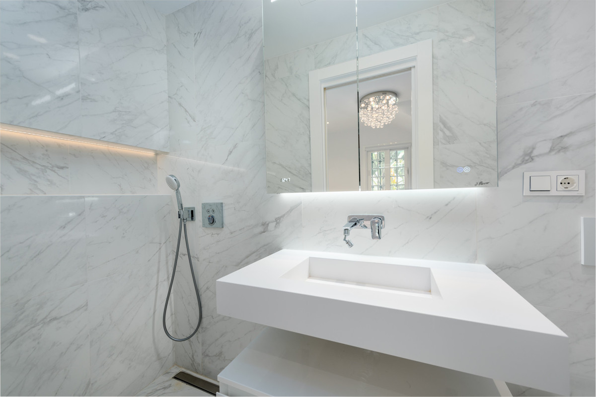 The master suite includes a custom-designed walk-in wardrobe and a luxurious en-suite bathroom with a stunning two-person bathtub. All bathrooms are fitted with high-end Villeroy & Boch fixtures and fittings. Two additional double bedrooms, both with en-suite bathrooms, complete the property.