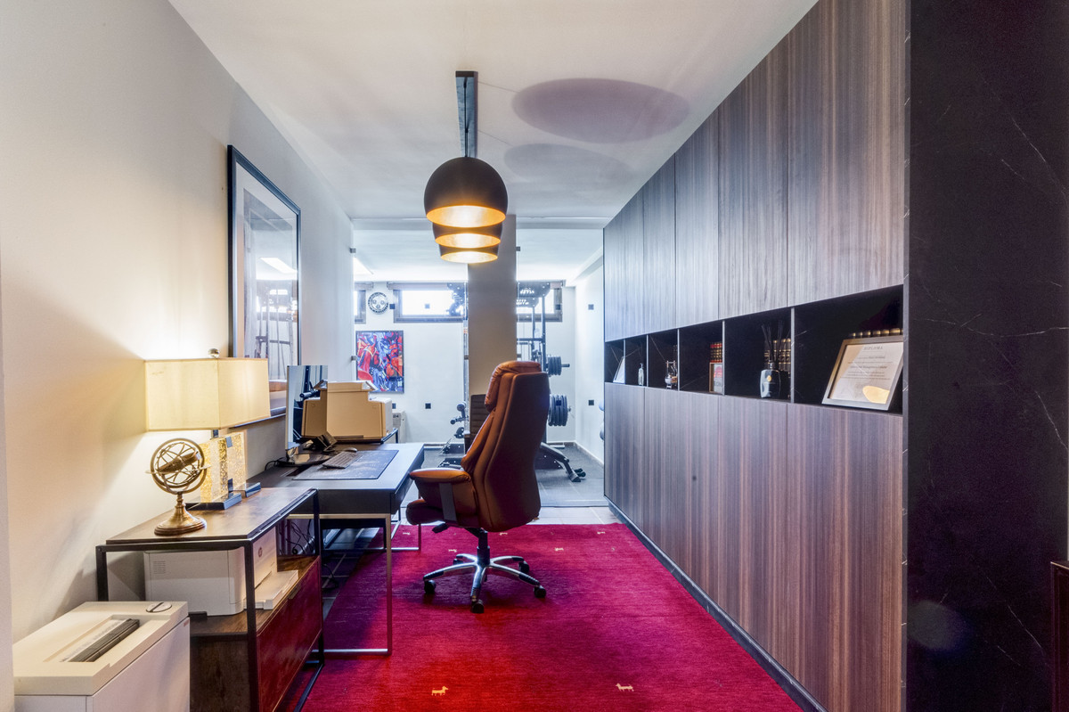 This villa offers an impressive layout across multiple levels. The lower floor incorporates a comfortable lounge area, a dedicated gym, a practical office room, a laundry suite, and a generous storage room. Living and entertaining spaces flow effortlessly thanks to an open plan living-dining arrangement, accentuated by a modern, fully-fitted kitchen. The villa benefits from both air conditioning and a fireplace, ensuring comfort throughout the year. Natural light bathes the interiors due to the southwest orientation, while multiple terraces and a solarium provide extensive areas for relaxation and al fresco dining. The private terrace is a particular highlight with serene views of the lake, lush gardens, and captivating panoramic vistas.
