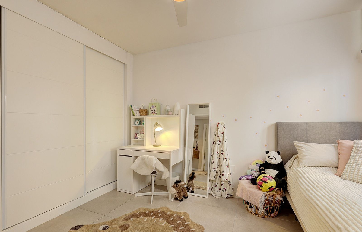 La chambre principale dispose d'une salle de bains privative et d'un accès direct à la terrasse, tandis que les autres chambres spacieuses sont équipées de placards intégrés. L'ensemble de la propriété bénéficie de finitions haut de gamme, notamment un carrelage en céramique, la climatisation réversible, le chauffage au sol, un système de détection de fumée et un système d'alarme intégré.