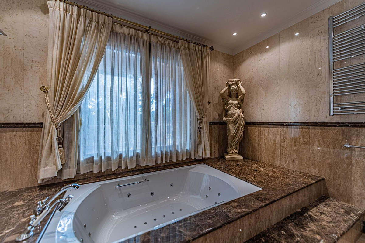 Luxury andalusian style villa that resides magnificently in one of the most prestigious and sought-after urbanizations in Marbella, Guadalmina Baja, only 100 meters from the beach and 5 minutes from Puerto Banus. The highest quality materials have been used in the design and construction of this elegant 8-bedroom home. The natural light throughout is accentuated by high ceilings and a multi-level floor plan. The villa offers a beautiful entrance hall leading to an Andalusian patio, a large fully fitted kitchen, 2 en-suite bedrooms, an elegant formal dining room and an expansive living area that leads to the covered terraces and lavish gardens. The first floor offers 3 large en-suite bedrooms and an elegant master suite with his and hers walk-in wardrobe and a private terrace with garden & partial sea views. This extraordinary property has been especially designed for a luxury lifestyle and offers a dream entertainment area that includes a pool billiard room, a fully equipped fitness suite, a Spa with sauna, jacuzzi, Turkish bath and ice fountain, a cinema room and a signature wine cellar, making this a haven of recreation. The manicured tropical gardens feature a large swimming pool, a small lake with waterfall, and a summer pergola under mature palm trees. The villa enjoys absolute privacy. Other features of this extraordinary property include: garage for 6+ cars, private lift, under-floor heating throughout, domotic system, solar panels, separate staff apartment, etc.