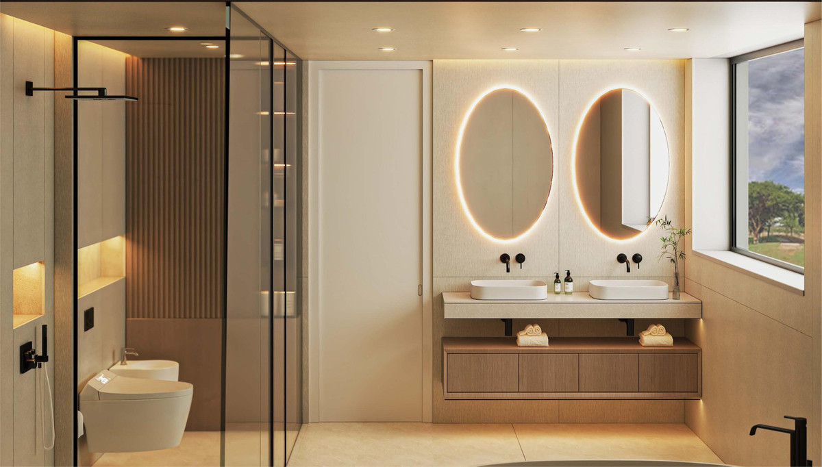 Upstairs, the master suite offers a true retreat of over 45 m², complete with a luxurious dressing area, en-suite bathroom, and a private lounge opening onto a panoramic terrace. Two further double bedrooms, each with en-suite bathrooms and walk-in wardrobes, are located across the hall, also accessible via elevator.