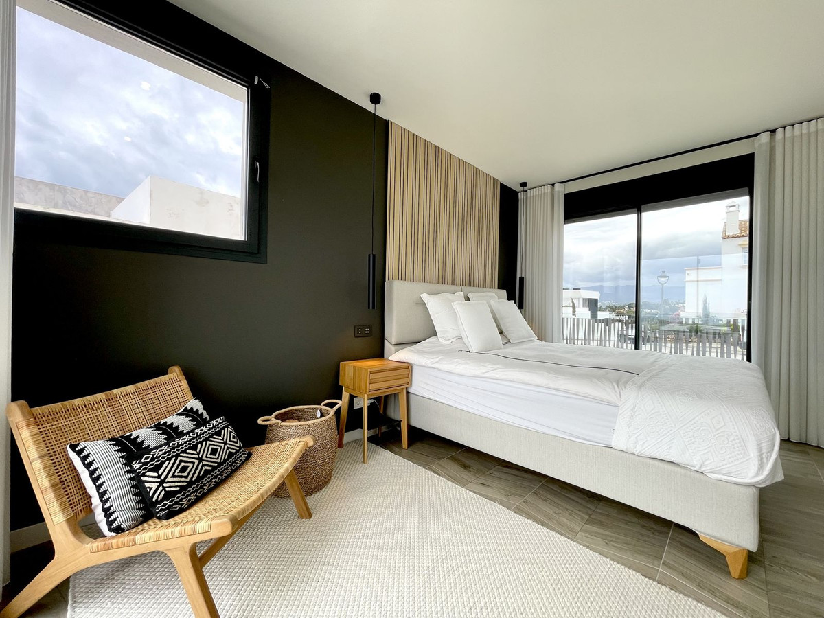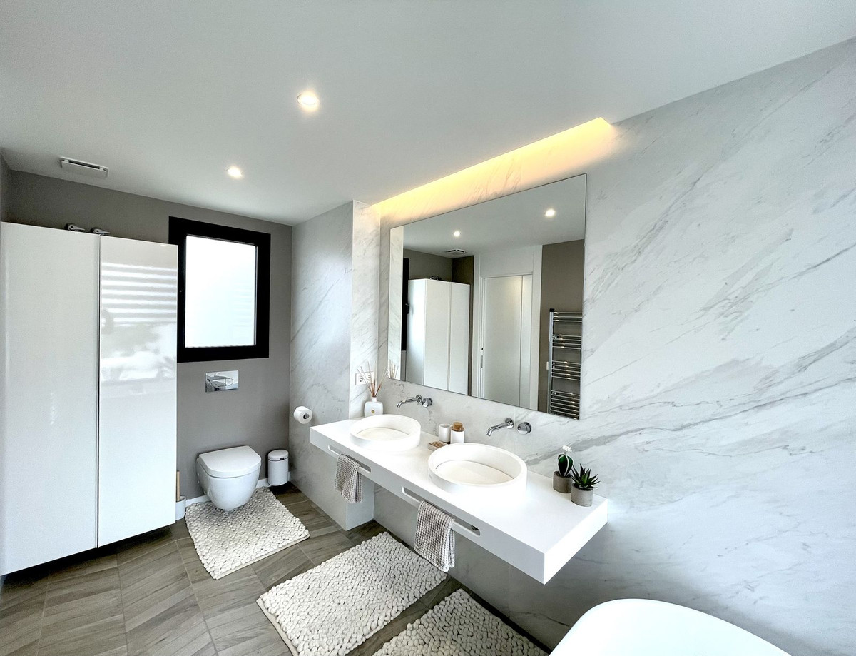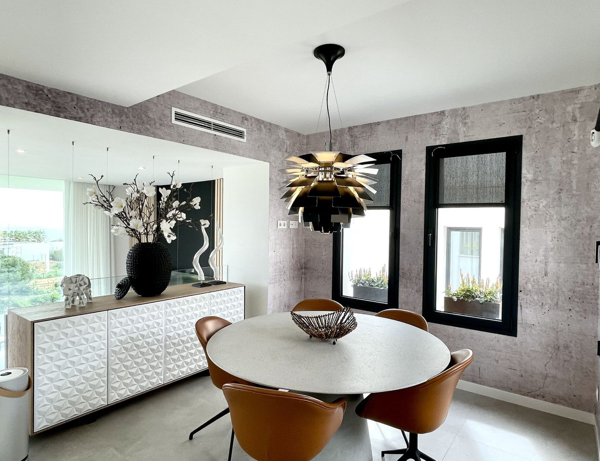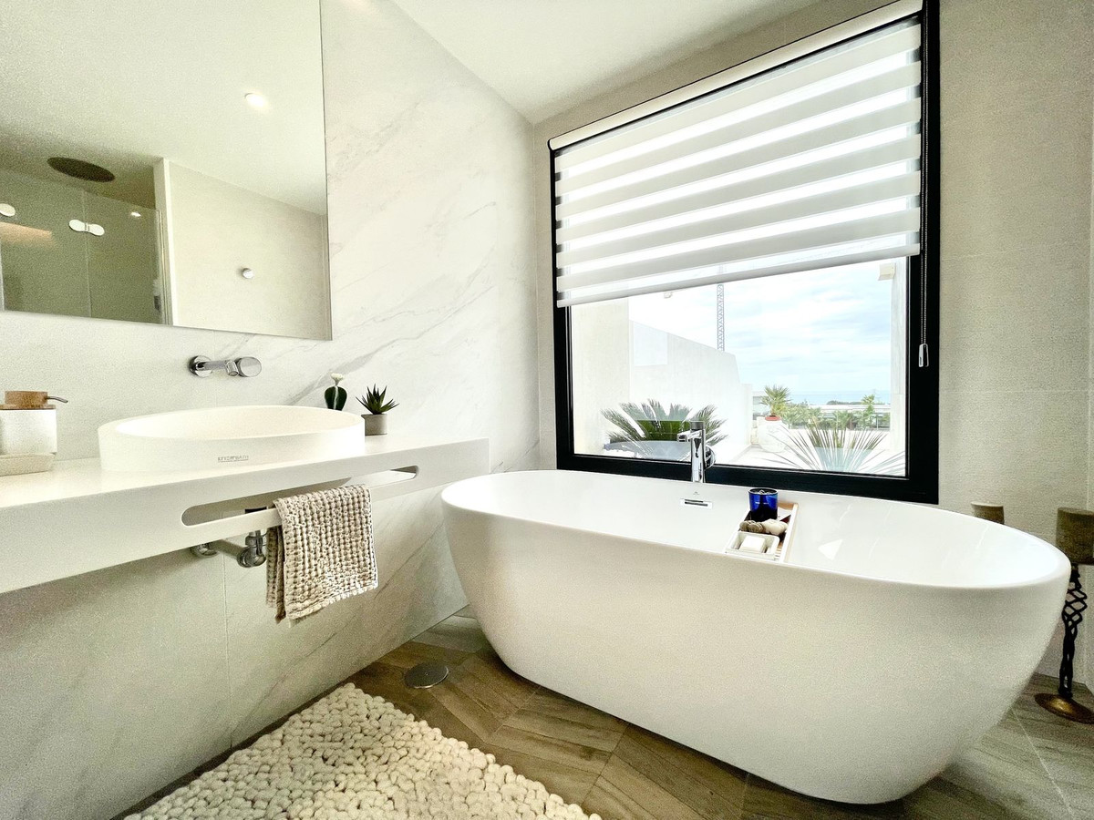 The Cape is an innovative residential project in Cabopino. This seaside wonder is located in the municipality of Marbella (Malaga), one of the most beautiful spots on Costa del Sol. The house is situated in a frontline golf, has 3 bedrooms all with en-suites and powder room, spacious terrace offers wonderful views of the Mediterranean Sea. There is a private swimming pool with sun terrace as well as private garden to enjoy the brightness of the region. The living room is designed to ensure wellbeing and offers ease and elegance with the hight of the ceiling of 3.60 metres.The architectural feature offers a very spacious and luminous space with stunning sea views to guarantee you a place of repose and leisure where to enjoy one of the most privileged areas of the world. The kitchen has been perfectly equipped with appliances NEFF, a brand that specializes in state of the art build-in kitchen appliances, Porcelanosa flooring, bathrooms and kitchen countertop with one piece integrated sink and top of the line faucets.Many upgrades have been done, extension of the master bedroom, laundry room with integrated sink and top of the line washer/dryer, exclusive lighting design, luxury automated window covering, wood paneling in the living room and bedroom, privacy glass curtain installed on the terrace separation, kitchen cabinets upgraded, tiled front porch, outdoor faucets installed, electric car charger installed next to the parking spot, energy efficient climate control by Aerotermia Daikin, in-floor heating through out the house.Must see to appreciate everything that this house has to offer.